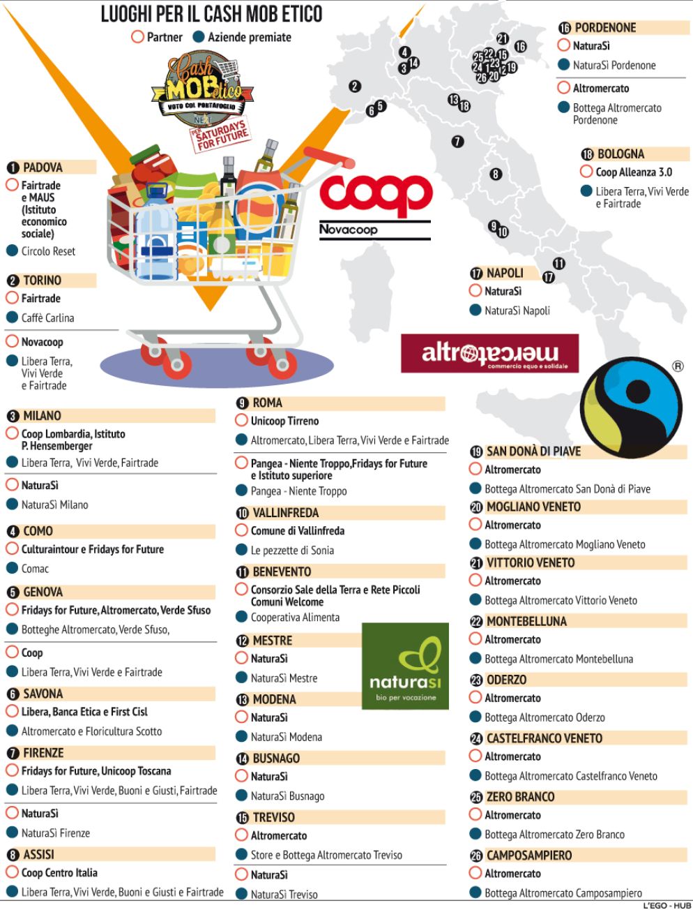 Le sedi del Cash mob etico. Saranno 26 i luoghi in cui si articolerà la mobilitazione nazionale di partenza. Sono previste iniziative a Milano come a Roma, Bologna, Firenze, Torino e Napoli. Ma sono coinvolti anche i Comuni più piccoli: da San Donà di Piave in Veneto a Vallinfreda nel Lazio. Hanno aderito ai 'sabati sostenibili' già tre colossi come Coop, Altromercato e NaturaSì. E altre realtà della grande distribuzione sono pronte a sposare il progetto a partire dal secondo appuntamento in programma a dicembre. In sostanza, ad ogni Fridays for Future seguirà un 'sabato sostenibile'.