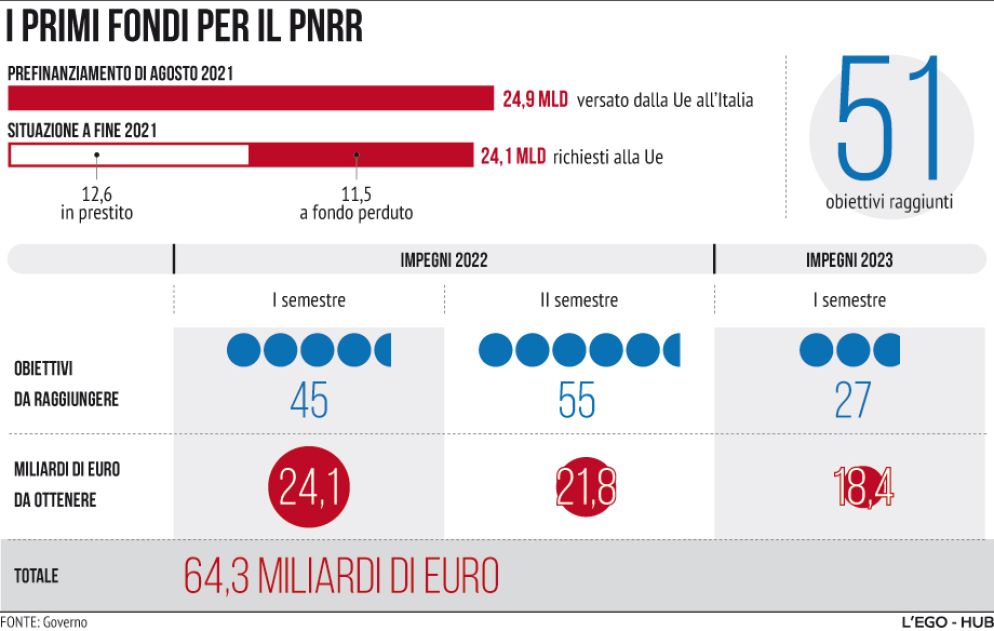 MISSIONI, ASSI E RISORSE Il Pnrr si articola in 16 componenti, raggruppate in 6 missioni - digitalizzazione e compe-titività (40 miliardi), rivoluzione verde (59), mobilità sostenibile (25), istruzione e ricerca (31), coesione (20) e salute (15) - che si muovono su 3 assi: innovazione, transizione ecologica e inclusione sociale. Gli obiettivi che deve raggiungere possono essere qualitativi (milestones) e quantitativi (target). Lo Stato paga le opere e le riforme e l’Europa le rimborsa. La prima rata da rendicontare alle istituzioni europee si è esaurita il 31 dicembre. Le risorse saranno erogate solo in seguito alla verifica del raggiungimento dei 51 traguardi e obiettivi previsti per quello step, di cui 27 sono connessi all’attuazione di riforme e 24 all’attuazione di investimenti. Nel 2022 vanno centrate 83 milestones e 17 target: dalla lotta al caporalato a quella contro l’evasione fiscale, dalla spending review al codice degli appalti. Sempre quest’anno dovremo risolvere i problemi della sanità territoriale e far partire gli appalti per la banda larga. Noi italiani abbiamo concordato con l’Europa di investire su digitalizzazione e innovazione, transizione ecologica e inclusione sociale, parità di genere, miglioramento delle competenze, della formazione e dell’occupazione giovanile, Mezzogiorno (dove si concentrerà il 40% delle risorse investite nei territori) e adattamento ai cambiamenti climatici, uso sostenibile e protezione delle risorse idriche e marine, economia circolare, riduzione dell’inquinamento dell’aria, dell’acqua o del suolo… e prima di darci i soldi, Bruxelles vorrà verificare l’efficacia degli interventi. Numeri alla mano: ad esempio, le spese fatte per fronteggiare la dispersione scolastica saranno valutate sulla base del tasso di abbandono scolastico. Il tema occupazionale sarà centrale. Ci si aspetta che il Pnrr porti il tasso di crescita italiano dallo 0,6 all’1,4%. Guerra permettendo.