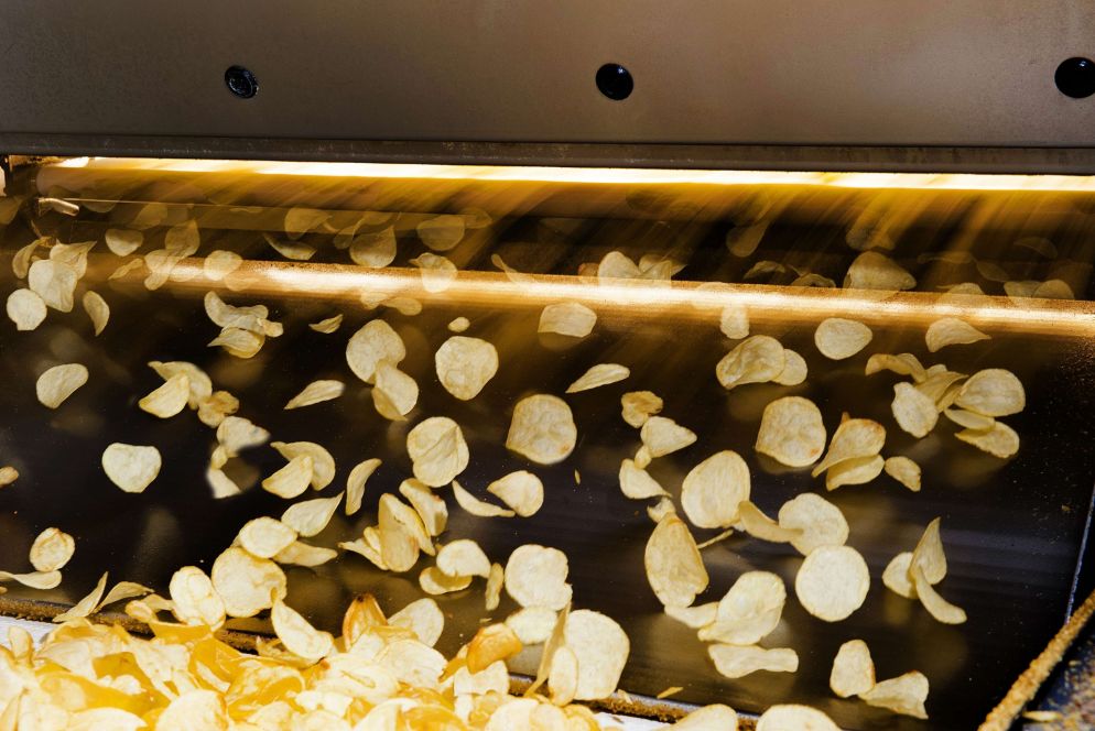 Quindi si entra nel vivo, mentre un incessante sottofondo sonoro di macchine in forsennata attività, se mette a dura prova l’udito, obbliga gli addetti alla produzione ad aguzzare la vista. Sono loro a sorvegliare che ogni iper-tecnologico macchinario compia alla perfezione il proprio dovere. Il primo lavaggio delle patate avviene con un sistema innovativo di gentle-washing per mantenerne il più possibile le sostanze nutritive, poi una doppia pelatura per abrasione, un secondo lavaggio e il taglio, che deve garantire uno spessore uniforme. Quindi la cottura in enormi e sofisticate friggitrici, con un mix di olii (palma e girasole, marchio registrato Sanoil) seguita da un passaggio che è il fiore all’occhiello dell’intera fase. Il fiume di patatine che scorre su velocissimi rulli si riversa in un forno ventilato che assorbe l’olio di frittura in eccesso fino a ridurlo alla soglia del 27% e del 22% per le patatine light.