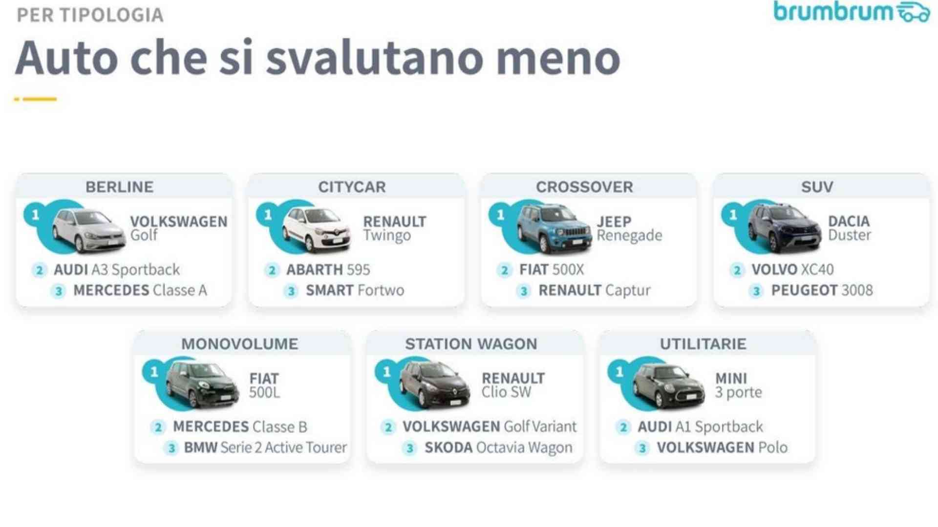 Guardando le classifiche precedenti, salta all’occhio che le tipologie di vetture che mantengono maggiormente il loro valore nel tempo sono citycar e utilitarie. Oltre alle auto citate, ci sono smart fortwo e Abarth 595 che conservano un’ottima percentuale del prezzo d’acquisto, indipendentemente dagli anni trascorsi. Cambiando tipologia, tra i SUV spicca Dacia Duster, che è al quarto posto nella classifica sia dopo tre anni, sia dopo cinque. Tra le berline, oltre a Golf, brillano Audi A3 Sportback e Mercedes Classe A, mentre il primo crossover è Jeep Renegade, seguito da 500X. Non bene, invece, station wagon e monovolume: ormai fuori moda e sempre meno richieste, sono tipologie di vetture che faticano a tenere il 60% del valore solo dopo tre anni.