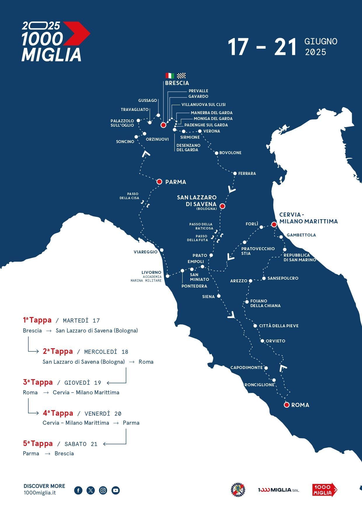 Un percorso che attraversa l’Italia più autentica. L’edizione 2025 conFerma il format delle cinque giornate, ripercorrendo il tracciato “a otto” delle leggendarie edizioni anteguerra. Gli equipaggi attraverseranno Desenzano, Sirmione, Verona, Ferrara, Prato, Siena, Orvieto, Arezzo, Sansepolcro, San Marino, Fino alla costa toscana con il suggestivo passaggio all’Accademia Navale della Marina Militare a Livorno e Parma prima di rientrare a Brescia. Un viaggio che unisce città d’arte, borghi storici e paesaggi mozzafiato, celebrando l’Italia come culla di bellezza, ingegno e cultura.
