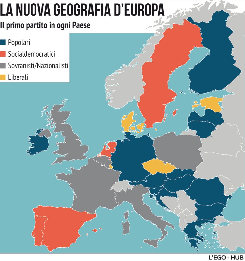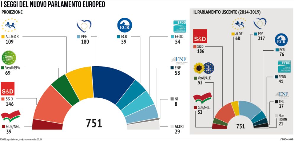 Detto questo, aumenta la frammentazione dell’emiciclo di Strasburgo. Calano, non in modo drammatico e secondo le previsioni, i popolari, che cedono voti in Germania, dove Cdu/Csu resta primo partito ma non può esultare del suo 28%, peggiore risultato degli ultimi anni. S&D, i socialisti, arretrano più vistosamente, con l’eccezione “latina” di Spagna, Portogallo e anche Italia (rispetto alle previsioni, anche se il Pd porterà meno deputati rispetto al 2014). I liberali di Alde&R diventano terza forza grazie al- l’apporto del partito di Macron, En Marche. Queste tre forze insieme raggiungono il 58% dei seggi, una maggioranza confortevole che potrebbe essere l’esito delle trattative, non facili, per individuare un presidente della Commissione Ue e, a cascata, i candidati alle altre posizioni chiave dell’Unione e delle sue istituzioni.