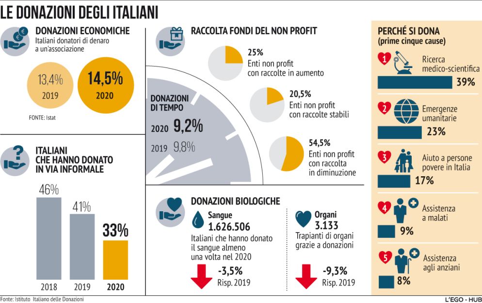 Il primo dato che colpisce riguarda il grande insieme dei cosiddetti 'donatori informali', coloro che offrono denaro direttamente senza passare da un’associazione – come avviene per l’elemosina in strada o le offerte raccolte durante le Messe – che sono crollati dal 41% del 2019 al 33% dello scorso anno. Come è facilmente intuibile hanno pesato i mesi di lockdown, nei quali non era possibile neppure la partecipazione alle funzioni religiose, tuttavia se si considera che nell’anno precedente alla pandemia si era già registrato un calo di 5 punti si ha l’idea di una tendenza negativa che purtroppo va consolidandosi. Si registra invece la crescita dei cittadini che effettuano donazioni alle associazioni. Si tratta di una netta minoranza, ma nel 2020 questa 'fettina' di popolazione è aumentata dal 13,4 al 14,5% degli italiani, per un importo medio di 80 euro.
