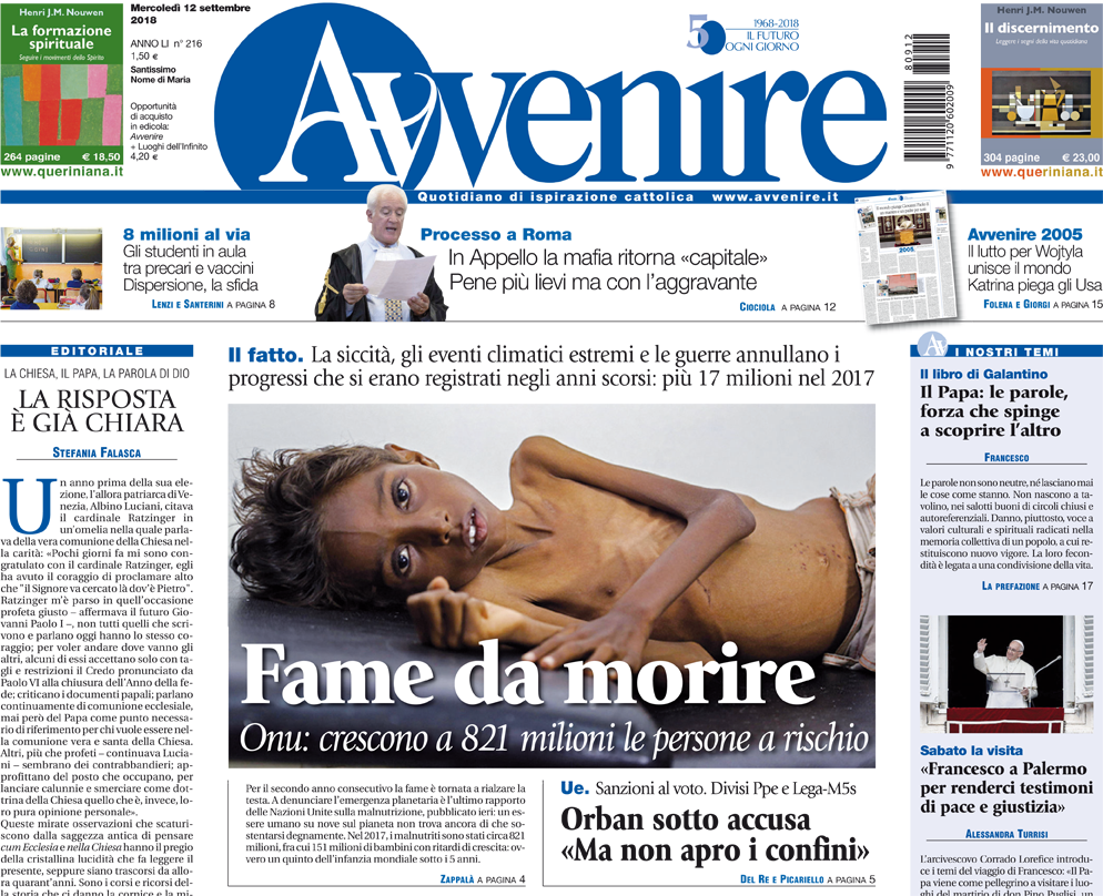 ho fissa sul mio tavolino la prima pagina di “Avvenire” del 12 settembre: «Fame da morire». E non riesco a distogliere lo sguardo. Ogni volta che mi siedo, gli occhi s’inchiodano sulla foto e sull’articolo di Daniele Zappalà, riguardante quel bambino denutrito. Quella creatura umana mi fissa con due occhioni imploranti cibo: “... ho fame, come posso crescere se non mangio, come posso andare a scuola, come posso vivere con la pancia vuota?”. È anche mio fratello, ma io ho tutti i giorni il primo piatto, il secondo, il contorno, la frutta, il caffè, il vino, e per di più l’acqua minerale! Come posso aiutarlo? Periodicamente mando un piccolo contributo (da pensionato) alla Caritas, o al Cuamm-Medici con l’Africa o all’Unicef, ma questo non può bastare. Il costante richiamo evangelico, anche attraverso il nostro giornale, di papa Francesco «avevo fame, avevo sete, ero forestiero... » mi affiora nell’animo nel vedere questo mio fratello così giovane e così denutrito. Può essere un richiamo, senza puntare il dito contro nessuno, a coloro che siedono “su alti scranni” a mettere le mani sul cuore e nel portafoglio. Grazie, caro direttore, per questo “pugno nello stomaco” che può far bene a tanti credenti e no, e può far riflettere ancora di più quando si vedono i nostri ragazzi che “smanettano” con cellulari, app e diavolerie varie, mentre lui chiede semplicemente e solo da mangiare...