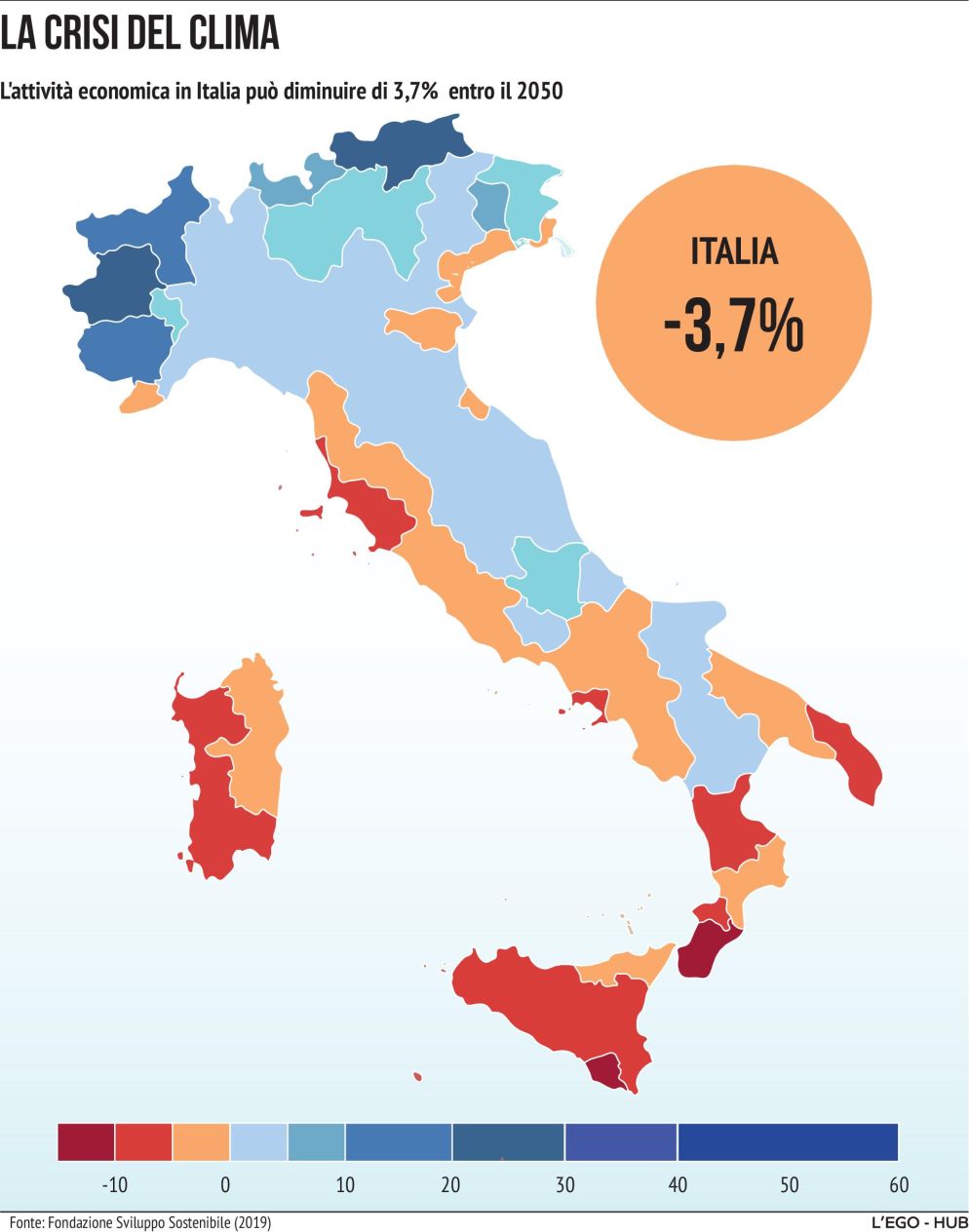 «Le ripercussioni sui Pil regionali sono uno degli effetti della previsione di crescita della temperatura a livello nazionale. Tra l’altro, consideriamo che l’Italia ha già registrato un innalzamento di 1,7 gradi rispetto al periodo preindustriale, contro gli 1,1 gradi registrati in media nel mondo nello stesso lasso di tempo». Perché il nostro Paese, come le altre nazioni dell’Europa meridionale, soffre di più i cambiamenti climatici: le stime prevedono che i danni economici nel sud Europa saranno otto volte maggiori di quelli nel nord. Oggi infatti un quarto della disuguaglianza globale tra nazioni è stata attribuita al cambiamento climatico. E l’Italia, pur non essendo fra le aree più povere e vulnerabili in assoluto, paga la sua collocazione mediterranea, che la rende u- no dei Paesi europei più esposti: il Mediterraneo è infatti caratterizzato da mutamenti climatici più accentuati rispetto ad altre zone del pianeta. Analizzando poi la dimensione locale, le zone più calde saranno quelle maggiormente colpite economicamente dall’aumento della temperatura: da noi, si tratta anche delle regioni più povere. Per queste ragioni l’impatto dei cambiamenti climatici porterà ad una crescente disuguaglianza economica a livello nazionale.