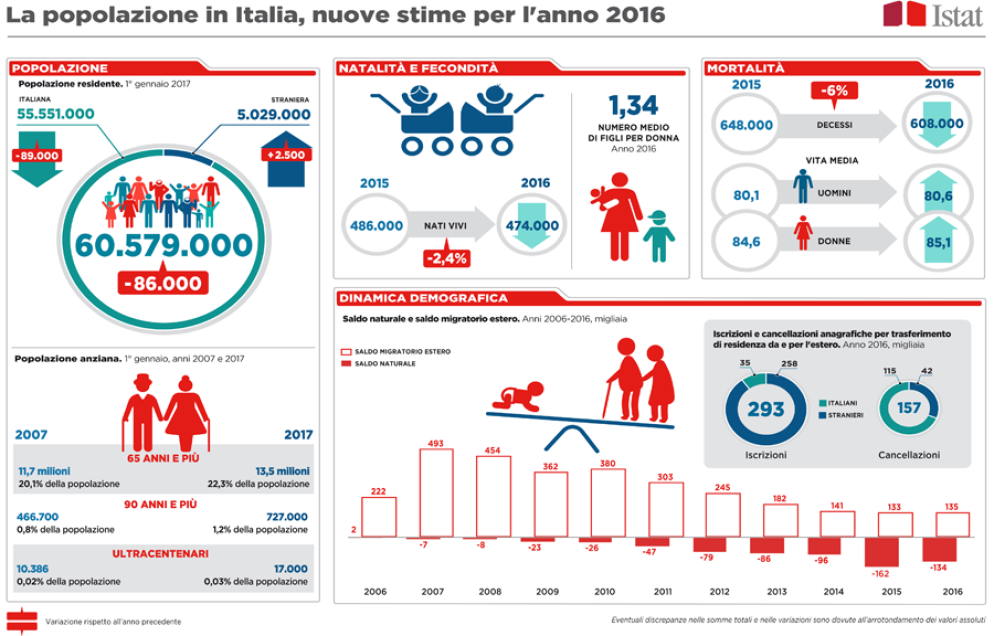 Si chiama "Statistiche Report", ma sembra quasi un bollettino di guerra. Ci si riferisce all’ultimo resoconto via web con cui recentemente l’Istat, nel diffondere gli "Indicatori demografici 2016" ci ha ufficialmente informato che lo scorso anno «la popolazione italiana ha perso 86 mila residenti», che «la natalità ha stabilito un nuovo record al ribasso nella storia del Paese», che il saldo naturale (nascite meno decessi) «è negativo e rappresenta il secondo maggior calo da circa un secolo» e, infine, che «il flusso di nostri connazionali trasferitisi all’estero – in molti casi si tratta di una vera e propria "fuga" di giovani italiani – è aumentato del 12,6% rispetto all’anno precedente». Come si vede, non mancano spunti su cui sarebbe doveroso soffermarsi – come abbiamo fatto in più occasioni –, sia per capire "come mai" siamo arrivati a vivere una crisi demografica di questa portata, sia per cercare di immaginare "con quali modalità" venirne fuori il più in fretta e nel miglior modo possibile.