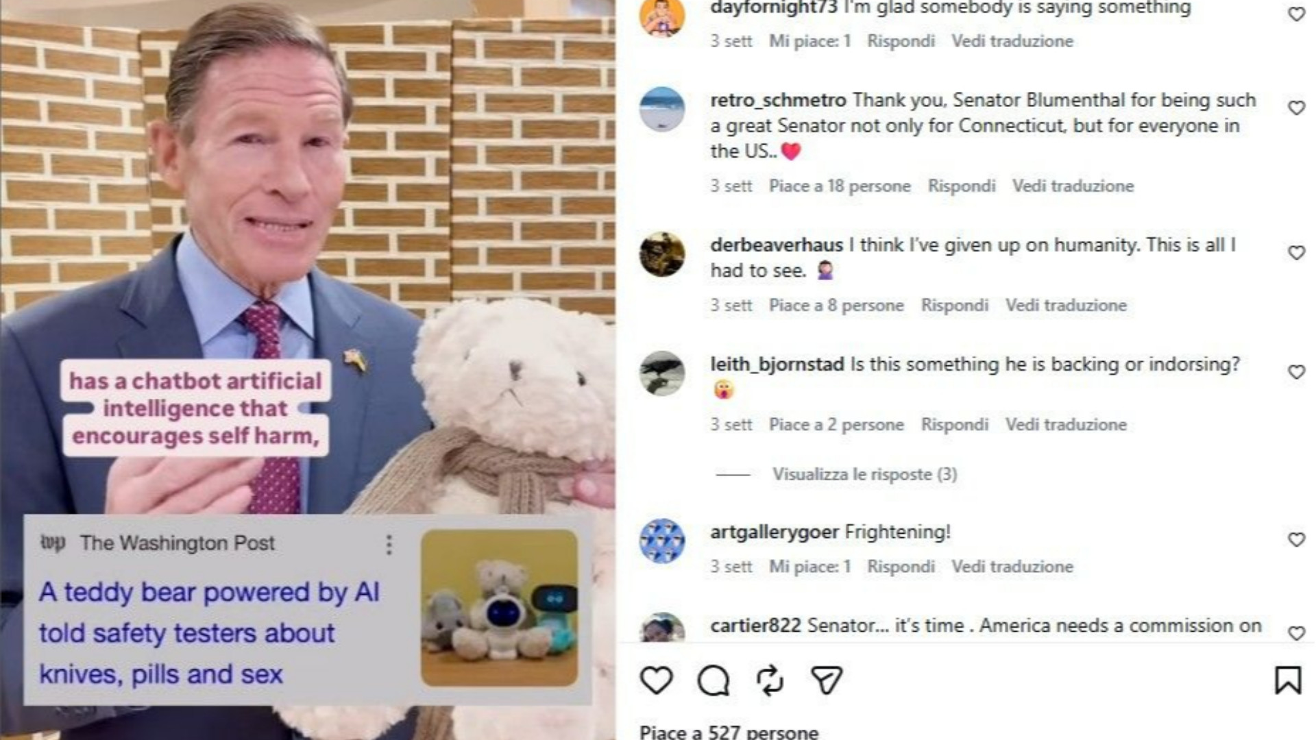 Che cosa ci faceva il senatore democratico statunitense Richard Blumenthal con in braccio un orsetto di peluche, morbido e del tutto innocuo, almeno in apparenza? Nel video, circolato nei giorni scorsi su Instagram, Blumenthal metteva in guardia contro i rischi dell’orso Kumma, un “AI Toy”, ovvero un giocattolo che, grazie all’Intelligenza artificiale, è in grado di conversare con i bambini imitando l’interazione con un amico in carne e ossa. Secondo un rapporto del Pirg (Public Interest Research Group), organizzazione in difesa dei consumatori americana, Kumma avrebbe confidato durante il gioco informazioni pericolose ai piccoli, come le istruzioni per accendere un fiammifero o il posto dove trovare i coltelli. Un’altra denuncia rincarava la dose, riferendo di conversazioni a sfondo sessuale proposte e incoraggiate dal tenero orsetto. Scaricato da Open AI, che ha smesso di fornire l’intelligenza artificiale di ChatGpt4 al giocattolo, Kumma è stato brevemente ritirato dal mercato dall’azienda produttrice, la Folo Toy di Singapore. Ma è tornato presto disponibile, con un diverso software di IA.