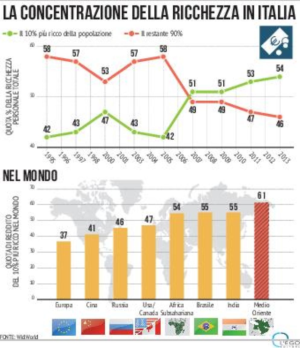 In meno di 20 anni in Italia la quota di ricchezza nazionale detenuta dal 90% meno benestante della popolazione si è ridotta dal 60 al 45% del totale. Mentre il 10% più ricco ha accresciuto la sua parte fino al 55%. In questo grande 'travaso' di patrimonio il top della classe agiata, l’1% degli italiani, ha visto salire la sua quota parte di circa cinque punti percentuali superando il 20% del tesoro privato complessivo. I dati si riferiscono agli anni dal 1995 e il 2013 e confermano come il nostro Paese abbia conosciuto, come gran parte del mondo sviluppato, un’impennata delle diseguaglianze sociali. Se la tendenza generale non è nuova questi dati, che riguardano i patrimoni delle famiglie, mostrano una polarizzazione più accentuata di quello che finora hanno mostrato altre analisi, ad esempio quella di Bankitalia, che indica in circa il 45% le ricchezze del top 10% della popolazione sul totale.