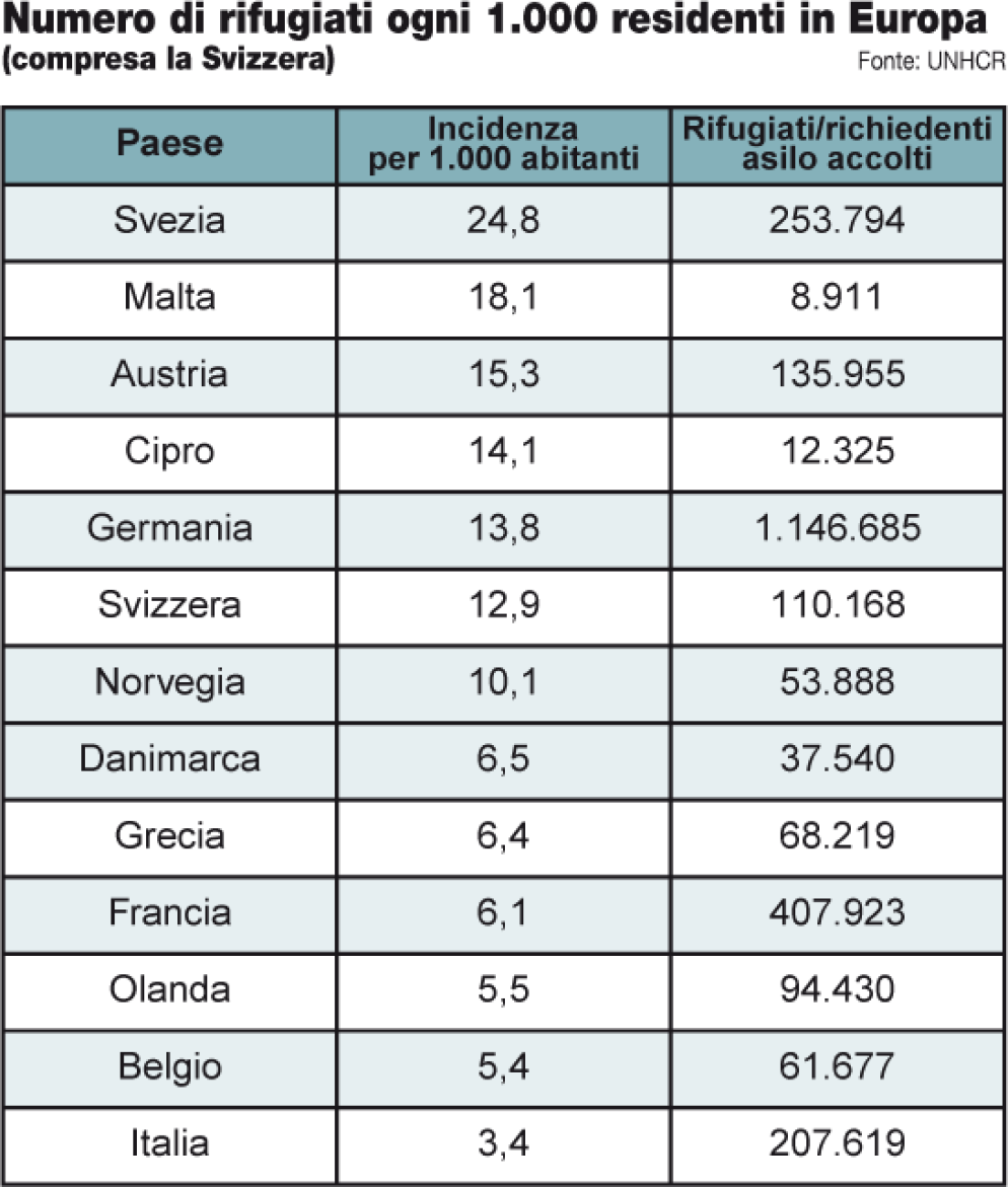 Rapportando il numero di rifugiati alla popolazione residente, il nostro Paese rimane ben lontano dai più impegnati sul tema: siamo a quota 3,4 ogni 1.000 abitanti, contro i 25 della Svezia e i 15 della 'cattiva' Austria