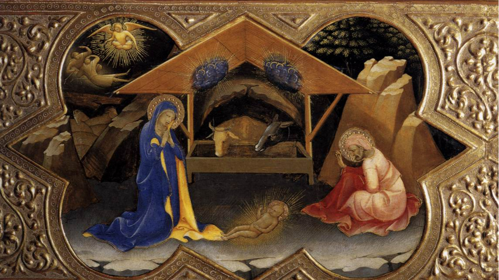 La capanna è una struttura così netta e appuntita da ricordare piuttosto un segnale stradale. Fermati qui, perché il centro dell’universo si è spostato in questo punto preciso. Si apre il cielo, piove il Giusto. Comprendi umano che smarrisci il senso sembrano dire il bue e l’asino. Nel linguaggio dell’arte cristiana non sono mai semplici comparse “realistiche”: sono memoria biblica. Scrive il profeta Isaia: “Il bue conosce il suo proprietario e l’asino la mangiatoia del suo padrone, ma Israele non conosce, il mio popolo non comprende”. Riconosci il segno? Te lo annunciano anche i due grappoli di notte compressa, nuvole di angeli, e folla invisibile, una moltitudine raccolta e trattenuta che testimonia che ciò che accade non è un fatto di campagna, ma il mistero del cosmo che passa da questo minuscolo bambino. Nudo, posato sul pavimento grigio-azzurro che sembra una lastra di pietra gelata, stella caduta, anzi gettata sulla terra. Irradia raggi d’oro, lampi che fanno scricchiolare il tempo affinché si squarci finalmente all’eterno che lo attende e lo redime. Maria è inginocchiata, raccolta, avvolta nel blu e nel giallo, già materia celeste, madre e figlia di quella Grazia che il Bambino reca nel mondo; Giuseppe, piegato nel rosso, appare stanco e reale, come uno che non comprende i calcoli del cielo ma si ritrova a custodirne la presenza sulla terra. A sinistra, tra le rocce spaccate che ricordano le montagne delle campagne toscane d’inverno, l’angelo annuncia ai pastori: l’irruzione della luce li rovescia e li spaventa. In questo quadro tutto è segnale e profezia, avvertimento e consolazione: l’infinito, anziché stare lontano, si è fatto vicino, e la stella più decisiva non brilla sopra la stalla, ma giace a terra ed illumina il mondo non per farsi misurare, ma per farsi amare. Antico e moderno, come solo il grande artista sa essere, Lorenzo Monaco ci invita a regalarci qualche silenzio in cui ascoltare lo scricchiolio del nostro mondo frenetico ma imbalsamato, efficiente ma glaciale. Lasciati spaesare, perché come la folgore viene da oriente e brilla fino a occidente, così sarà la venuta del Figlio dell’uomo. Anche nel tuo cielo.