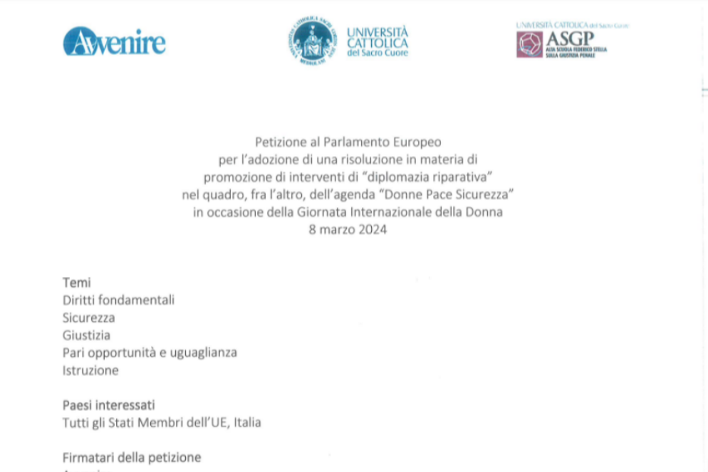 Il titolo integrale del documento è “Petizione al Parlamento Europeo per l’adozione di una risoluzione in materia di promozione di interventi di “diplomazia riparativa” nel quadro, fra l’altro, dell’agenda “Donne Pace Sicurezza” in occasione della Giornata Internazionale della Donna 8 marzo 2024”.