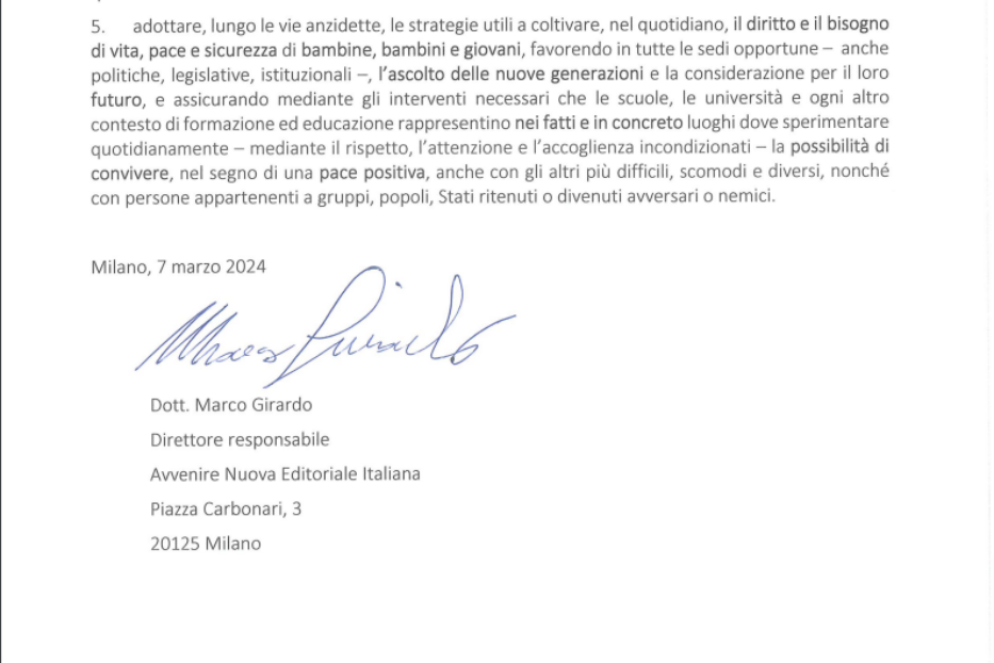 5. adottare, lungo le vie anzidette, le strategie utili a coltivare, nel quotidiano, il diritto e il bisogno di vita, pace e sicurezza di bambine, bambini e giovani, favorendo in tutte le sedi opportune – anche politiche, legislative, istituzionali –, l’ascolto delle nuove generazioni e la considerazione per il loro futuro, e assicurando mediante gli interventi necessari che le scuole, le università e ogni altro contesto di formazione ed educazione rappresentino nei fatti e in concreto luoghi dove sperimentare quotidianamente – mediante il rispetto, l’attenzione e l’accoglienza incondizionati – la possibilità di convivere, nel segno di una pace positiva, anche con gli altri più difficili, scomodi e diversi, nonché con persone appartenenti a gruppi, popoli, Stati ritenuti o divenuti avversari o nemici.