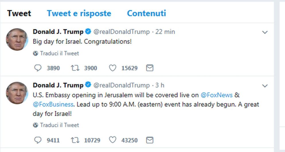 Il presidente americano Donald Trump ha salutato così l'inaugurazione dell'ambasciata Usa a Gerusalemme: «È un grande giorno oggi per Israele. Complimenti!». E a proposito delle vittime, ha detto: «È colpa di Hamas».