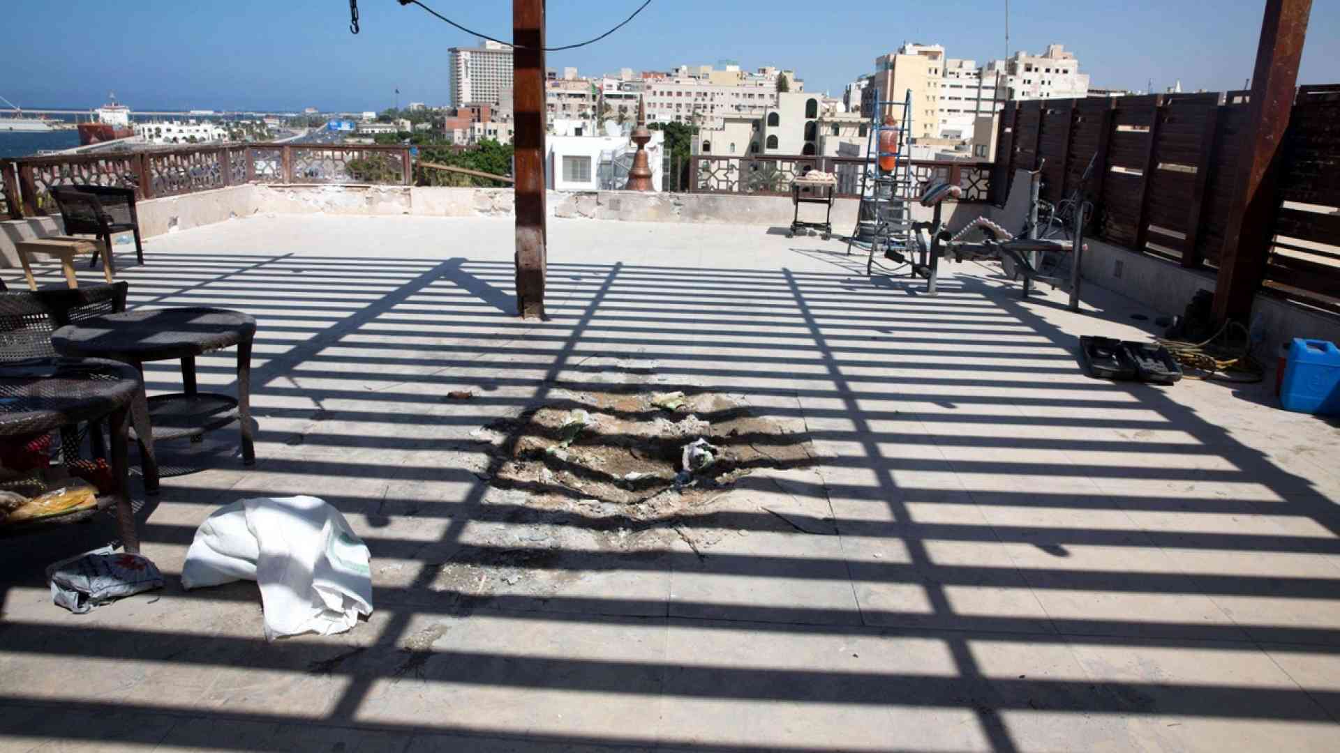 Il tetto dell'hotel Al-Waddan danneggiato dai razzi (Ansa)