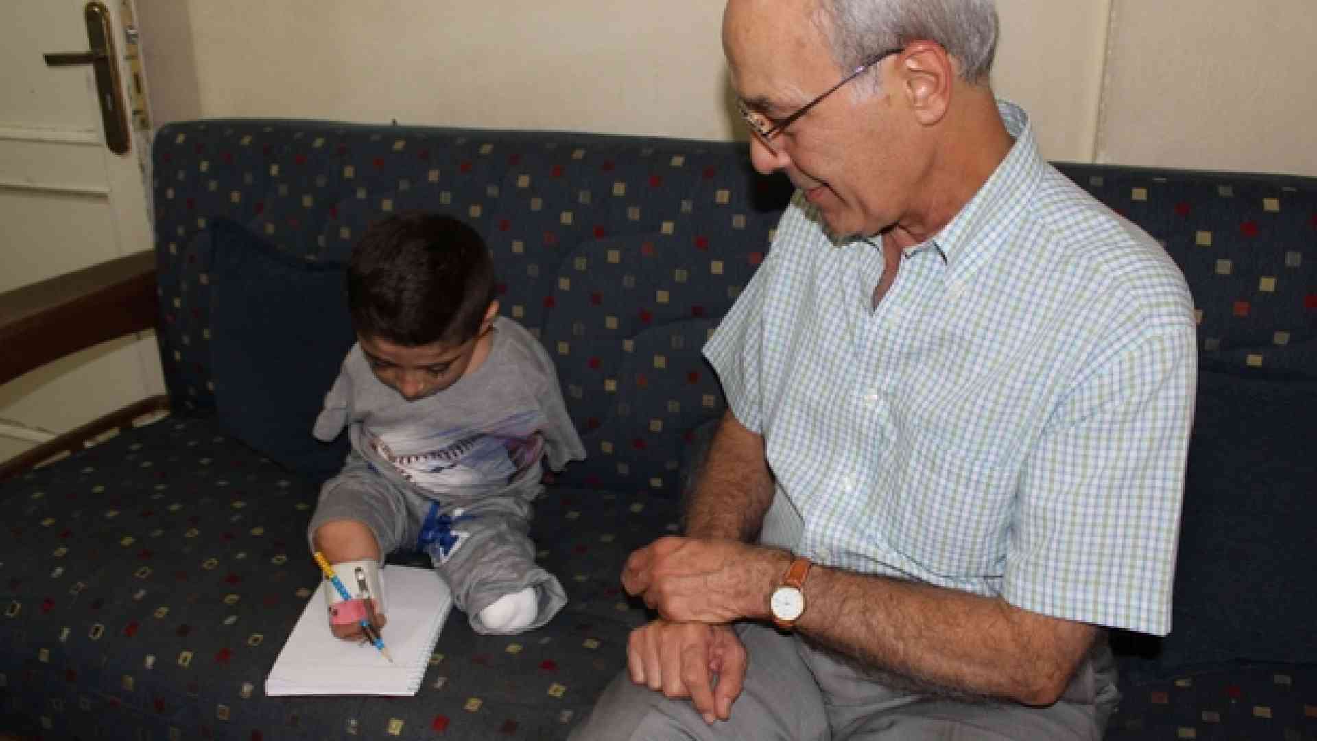 Ogni mattina, con l’aiuto di un volontario dei “Maristi blu” va nella sua scuola elementare ad Aleppo e, attraversati atrio e corridoi, quando si siede al banco toglie entrambe le protesi alle gambe. I due moncherini si appoggiano con naturalezza anche sul divano di casa, mentre una specie di cinturino, stretto appena sotto il ginocchio destro, permette di agganciare una matita o una penna: 1, 2, 3, scrive, o incomprensibili lettere arabe. Le gambe, Mahmud al-Khalaf, le ha perse il 27 novembre del 2015 mentre con mamma Hamar e lo zio Khaled stava fuggendo da Tadef, la sua cittadina caduta da un anno in mano al Daesh.
