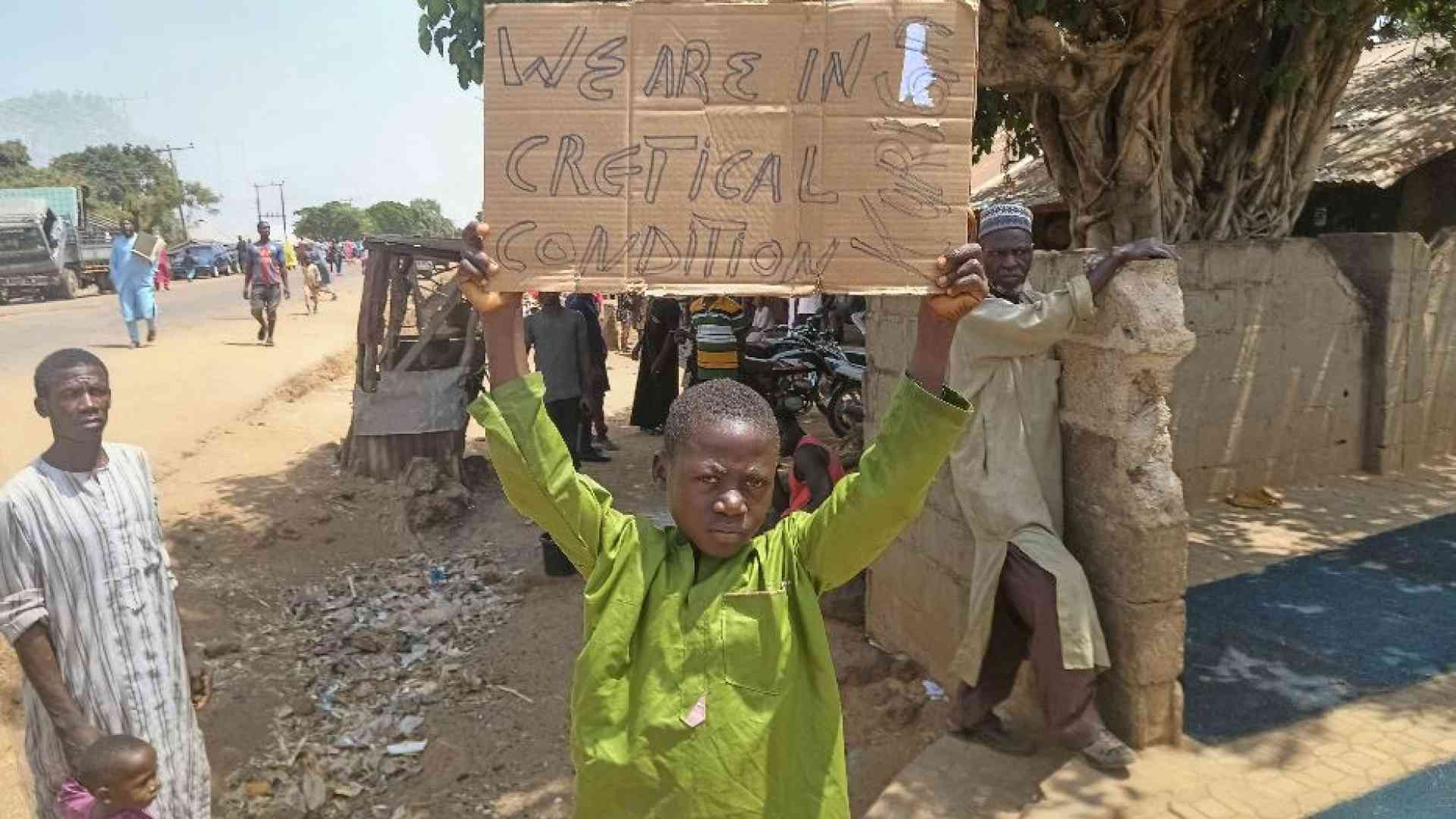 Reuters | Un bambino con un cartello di richiesta di auto per gli studenti di Kuriga