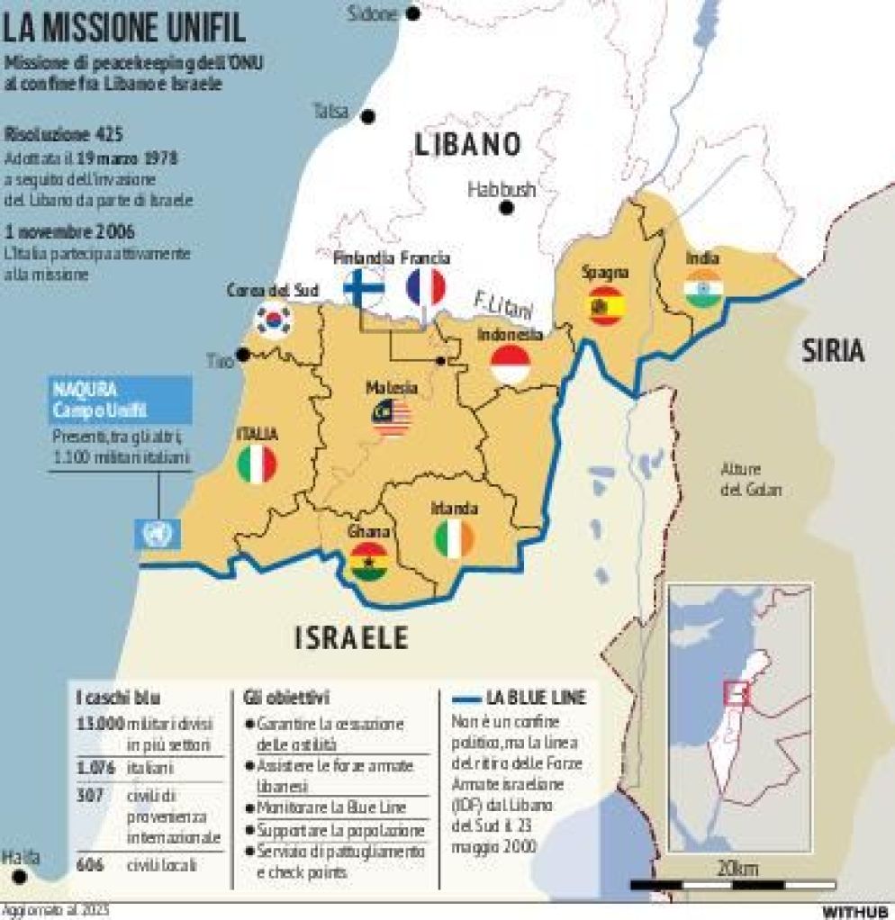 La notizia è confermata da Andrea Tenenti, portavoce della missione Onu di cui fanno parte un migliaio di italiani. Nel mirino dell'esercito israeliano sono finite tre postazioni dell'Unifil in quella Linea Blu di separazione tra i confini israeliano e libanese. Due basi sono italiane, la terza è il quartier generale della missione a Naqura, sulla costa. Chiuso anche il porto della cittadina, che veniva utilizzato dalla missione internazionale. Ora dovrà servirsi del più settentrionale porto di Tiro.