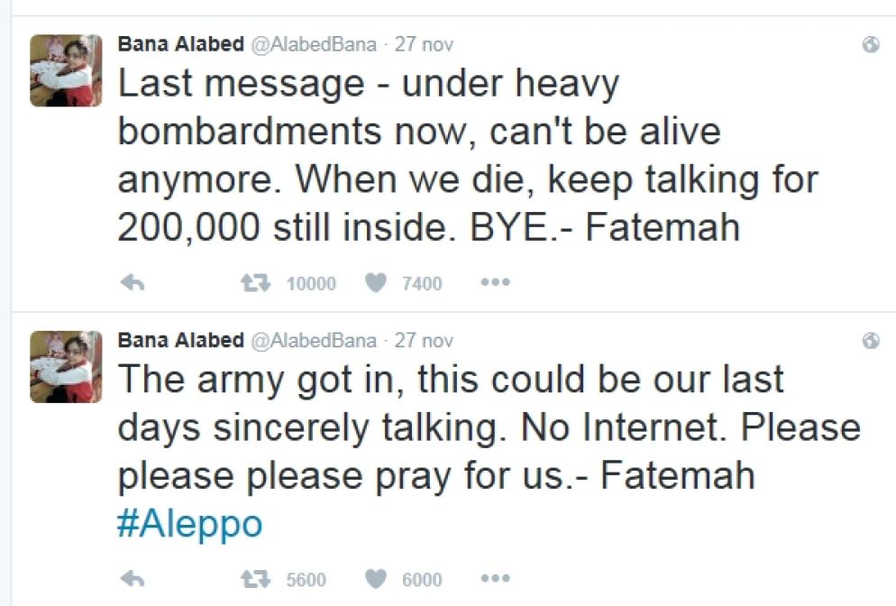 Nella giornata di domenica Bana ha scritto ai suoi 94.000 follower: "Questo potrebbe essere l'ultimo giorno in cui possiamo parlare liberamente. Non c'è internet. Per favore, per favore, per favore pregate per noi". E ancora, poco dopo: "Ultimo messaggio - sotto pesanti bombardamenti, non possiamo più restare vivi. Quando moriremo continuare a parlare delle 200.000 persone che sono ancora qui. Ciao".