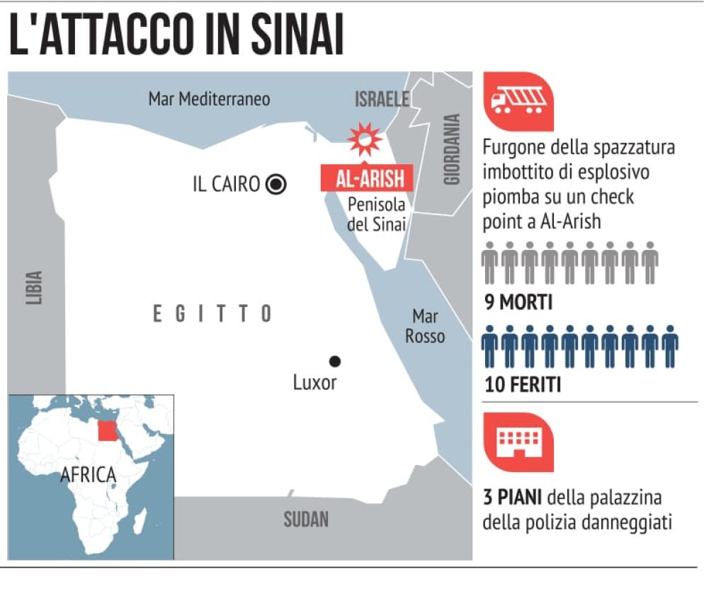 Ennesimo attentato contro le forze di sicurezza nel nord della penisola del Sinai. Un camion imbottito di esplosivo ha investito un check-point davanti a un edificio della polizia ad al-Arish