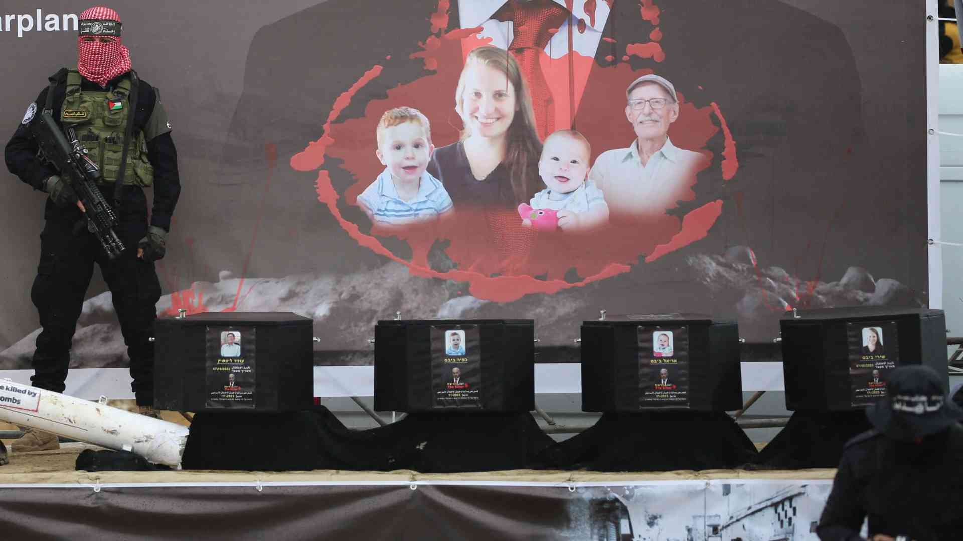 Il macabro show di questo rilascio, il primo di ostaggi deceduti, è avvenuto in una coreografia persino più feroce delle precedenti. Una gigantografia raffigurava il premier israeliano Benjamin Netanyahu come un vampiro - una specie di Dracula - che grondava il sangue in cui erano avvolti i volti sereni delle quattro vittime. Una scritta a fianco recitava, in inglese: «Il criminale di guerra Netanyahu e il suo esercito nazista li hanno uccisi con i missili dei bombardieri sionisti». Sullo sfondo, immagini di feretri coperti da bandiere israeliane: «Ritorno alla guerra, ritorno dei rapiti nelle bare».