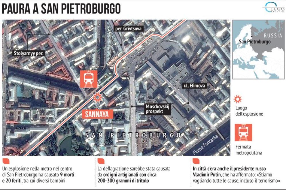 «Terrorismo». Il presidente russo Vladimir Putin non ha esitato a usare questa parola, a indicare la pista privilegiata, poche decine di minuti dopo la strage avvenuta nella metropolitana di San Pietroburgo che ha causato almeno 14 morti (11 morti sul colpo e altri tre deceduti nella notte) e 50 feriti tra cui alcuni bambini, secondo il ministero della Salute. Il bilancio delle vittime potrebbe però aggravarsi, in quando alcuni feriti sono molto gravi. L'esplosione è avvenuta attorno alle 14 italiane, a bordo di un convoglio che viaggiava tra le stazioni di Tekhnologichesky Institut e di Sennaya Ploshchad, in pieno centro.