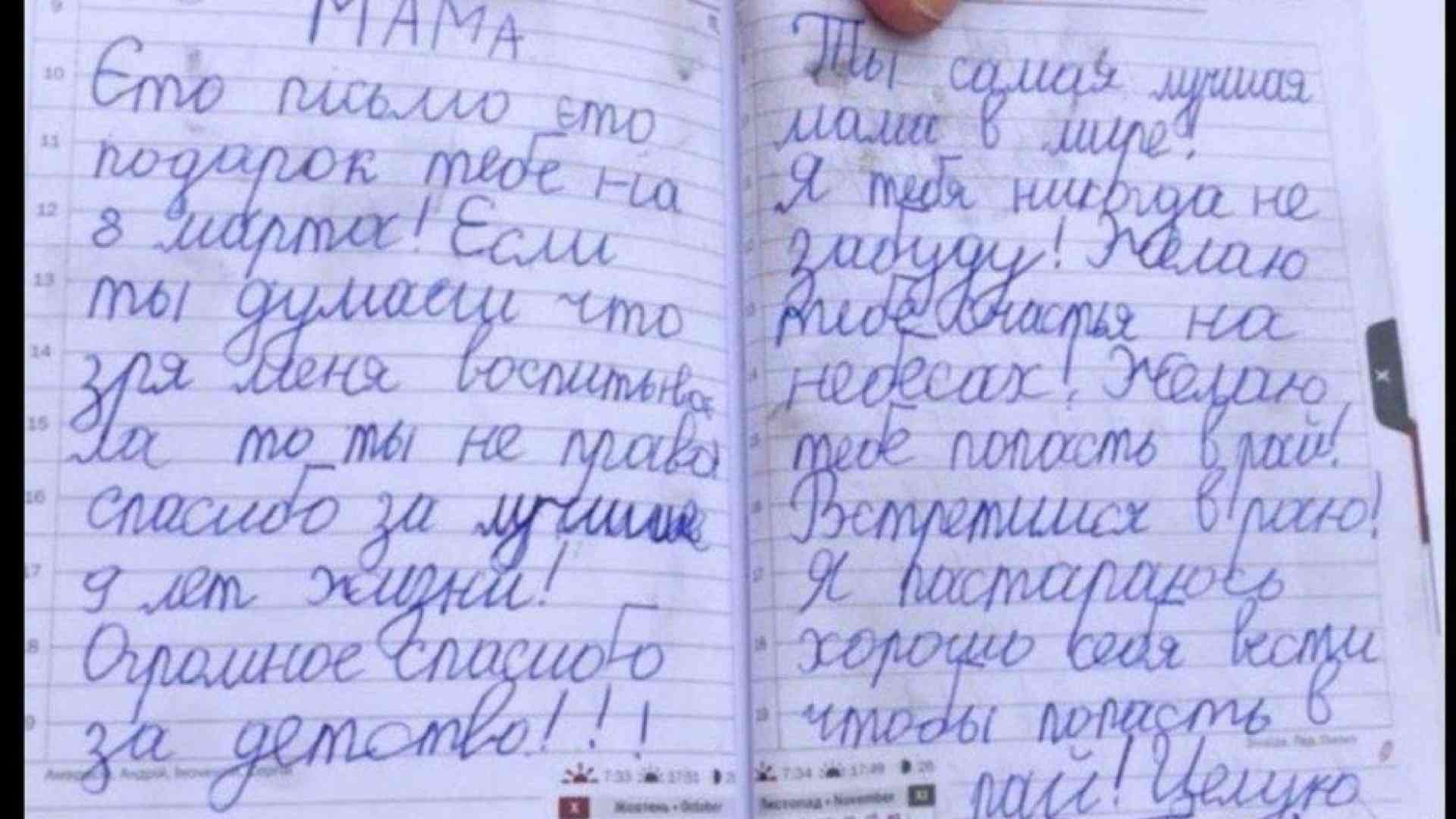 Al testo di Galia non bisogna aggiungere altro. "Mama! Questa lettera è il regalo per te in occasione dell' 8 marzo (Giornata internazionale della donna)! Se pensi di avermi cresciuto ed educato per niente, ti sbagli! Grazie per i migliori 9 anni della mia vita! Grazie mille per la mia infanzia!!! Sei la mamma migliore del mondo! Non ti dimenticherò mai! Ti auguro la felicità nel Paradiso! Auguro che tu vada in Paradiso! Ci vediamo in Paradiso! Farò del mio meglio per essere una brava persona e andare anch'io in Paradiso! Ti bacio! Galia!".