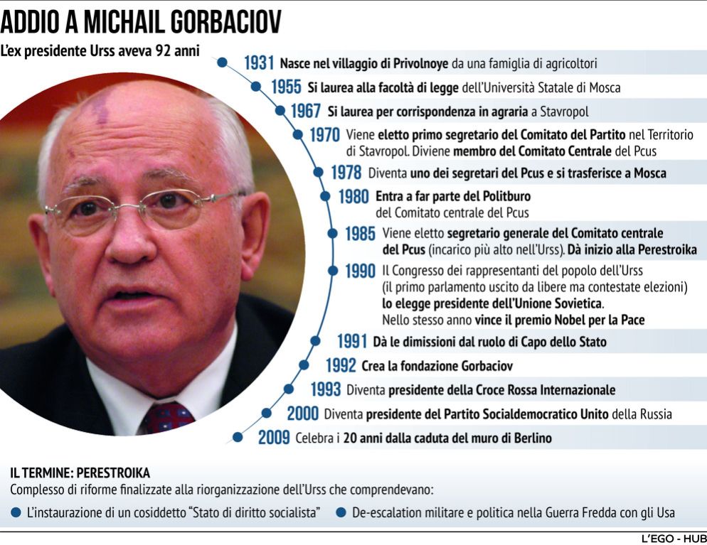 All’età di 91 anni, e dopo una lunga malattia, si è spento Mikhail Sergeeevic Gorbaciov, l’ultimo segretario del Pcus, il primo e unico Presidente dell’Urss, il premio Nobel per la Pace.