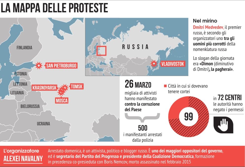 Incriminato anche il leader dell'opposizione Alexei Navalny, che aveva esortato a partecipare a manifestazioni e cortei in tutta la Russia contro la corruzione