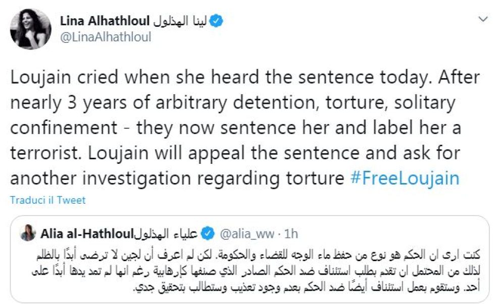 Lina ha pubblicato un altro post, in cui afferma che Loujian ha pianto quando ha sentito la sentenza. "Mia sorella non è una terrorista ma una attivista", ha scritto ancora.