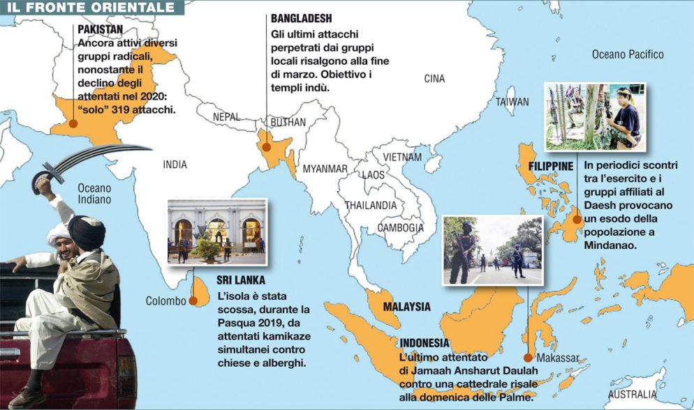 L’attentato avvenuto nella Domenica del Palme contro la cattedrale di Makassar, capoluogo della provincia indonesiana del Sulawesi meridionale, ha riacceso i riflettori sul fenomeno jihadista in Asia. Che assume recentemente i connotati di un jihadismo “family style”, coinvolgendo anche donne e bambini dello stesso nucleo familiare. L’attentato in questione era stato condotto da due giovani coniugi, arrivati sul luogo in motocicletta prima di far esplodere una pentola a pressione imbottita di esplosivo. Il crollo militare del Daesh e la successiva morte del suo leader, Abu Bakr al-Baghdadi nell’ottobre 2019 hanno avuto una serie di conseguenze anche per il continente asiatico. La prima è strettamente connessa al rientro in patria dei jihadisti partiti per il Medio Oriente. La maggior parte degli oltre 1.200 combattenti originari del Sud-est asiatico andati in Iraq e Siria a partire dal luglio 2014 era costituita da indonesiani. L’esperienza bellica di questi ha incrementato l’influenza del Daesh in una vasta area fino ad allora dominata dai gruppi radicali affiliati ad al-Qaeda, come la Jemaah Islamiyyah. Se, infatti, questo gruppo è stato responsabile della maggior parte degli attentati avvenuti in Indonesia negli anni 2000-2009, l’ago della militanza jihadista si è spostato ora a favore dei gruppi affiliati o vicini al Daesh, come Jamaah Ansharut Daulah ( Jad) e Mujahidin Indonesia Timur (Mit), responsabili dei 13 attentati avvenuti dal 2016 a oggi nel Paese. Crescente preoccupazione anche in India, dove si moltiplicano le notizie di cellule smantellate dalle forze dell’ordine, dal Madhya Pradesh al Kerala e dal Karnataka a Hyderabad. Con la nascita, nel maggio 2019, di una “Wilaya dell’India”, il Daesh ha potuto inoltre inserirsi nel groviglio jihadista del Kashmir, da decenni al centro di una disputa territoriale tra India e Pakistan, come sta ultimamente cercando di strumentalizzare la questione dei profughi Rohingya, fuggiti dal Myanmar. L’unico dato positivo sembra riguardare la Malaysia, dove gli arresti di sospetti terroristi sono calati dai 72 del 2019 a soltanto 7 lo scorso anno. Secondo il capo dell’antiterrorismo locale, Normah Ishak, dietro quella «camuffata benedizione» che ha ridotto la minaccia operativa del sedicente Stato islamico nel Paese sta però solo la pandemia che ha paralizzato ogni attività dietro le quali si può mascherare ed agire.
