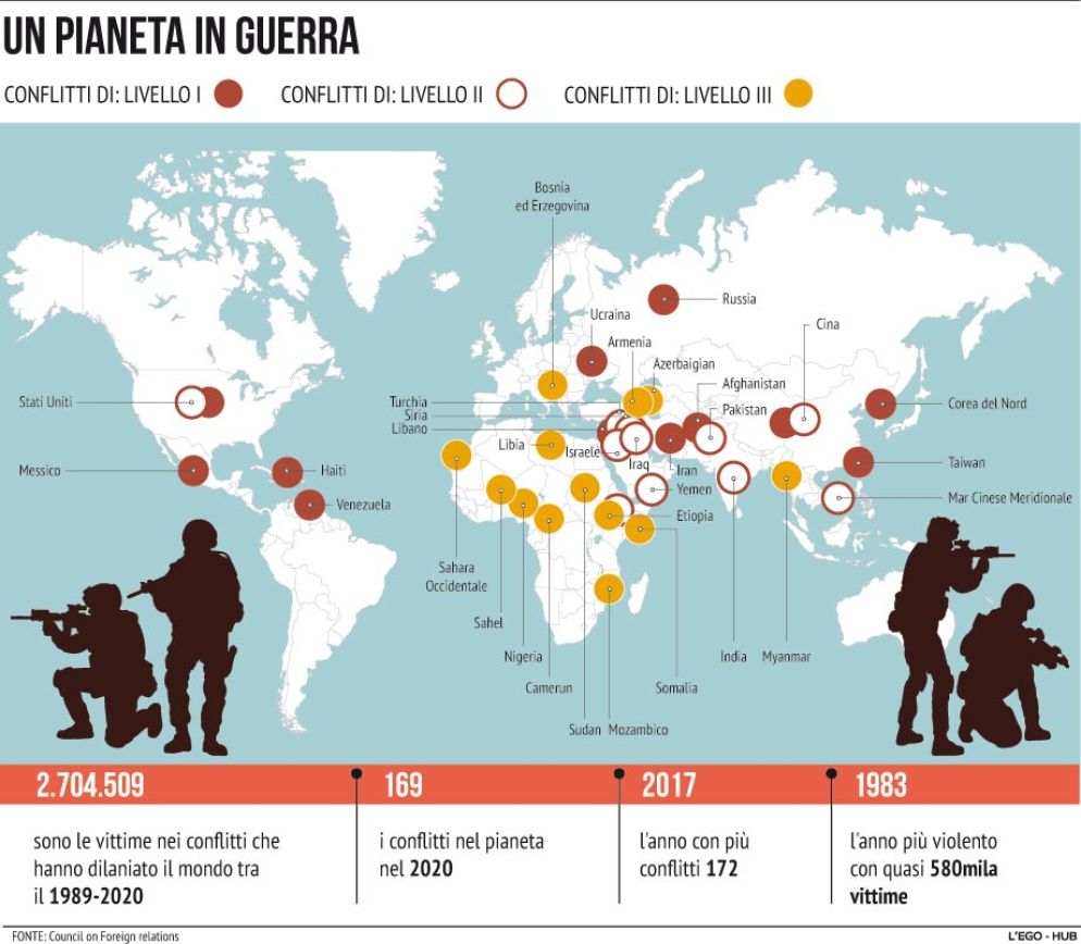 Sono 16 le guerre escluse dall’agenda mediatica: record all’Africa ma l’America Latina è la più violenta. Spiragli di soluzione in Yemen, Tigrai e Nagorno Karabakh