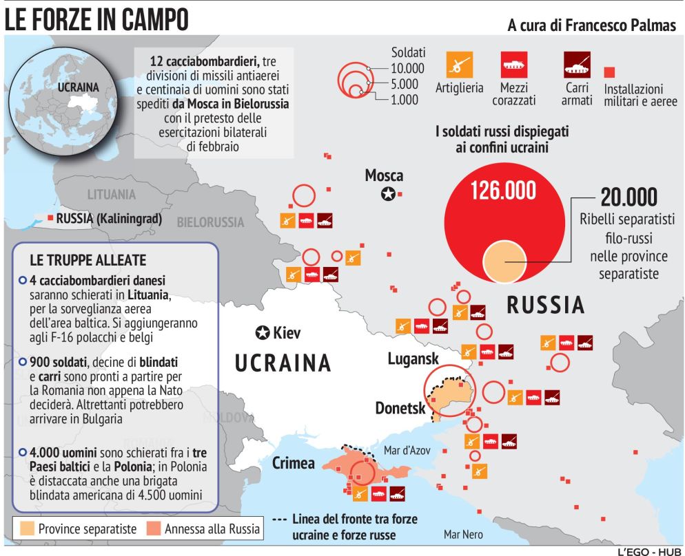 Il Cremlino vuole scongiurare ad ogni costo l’ingresso dell’Ucraina nella Nato. Vorrebbe una zona cuscinetto lungo le frontiere occidentali del paese, per ‘finlandizzare’ Kiev ed evitare di ritrovarsi le truppe occidentali nel giardino di casa. Ha già dovuto digerire l’inglobamento di 12 paesi satelliti dell’era sovietica nelle strutture militari occidentali. Teme che la Nato e gli americani possano servirsi del territorio ucraino per stabilirvi basi e radar, con nuovi intercettori antimissili, come quelli dispiegati in Romania e in Polonia, accusati di alterare l’equilibrio della deterrenza nucleare reciproca. È una questione di status e delle brame di potenza in ascesa della Russia. Per ottenere garanzie scritte dagli occidentali, Mosca sta attuando un corposo dispiegamento di forze fra la Bielorussia, il distretto occidentale a ridosso del confine ucraino e la Crimea. Sta manovrando anche con la flotta, facendo temere ai più un blocco navale delle coste ucraine, contro Odessa e Mariupol, per far scendere al compromesso il governo Zelenski. Alcuni temono che le 6 unità d’assalto anfibio arrivate dal Baltico al Mar Nero a inizio settimana siano il preludio ad uno sbarco sulle spiagge ucraine, che affiancherebbe l’offensiva aeroterrestre.