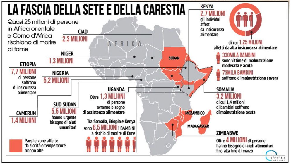 «Facciamo appello alla comunità internazionale affinché la gente non muoia per mancanza di cibo», erano state le parole di Dominik Stillhart, a capo delle operazioni per il Comitato internazionale della Croce Rossa (Cicr), durante la sua recente visita in Somalia, dove nella precedente carestia morirono 250mila persone. Nel Corno d’Africa 6 milioni di civili hanno urgente bisogno di cibo. E i prezzi dei prodotti alimentari sono aumentati radicalmente in varie zone. In Kenya, la più forte economia della regione, il governo ha ricevuto forti pressioni affinché venissero rimossi «gli ostacoli commerciali» interni ed esterni. Mentre in Etiopia, dove «la crisi sta colpendo almeno 7,7 milioni di persone e milioni di animali “domestici”», si stima che «oltre 600 scuole hanno chiuso e l’istruzione di 5 milioni di bambini è a rischio».