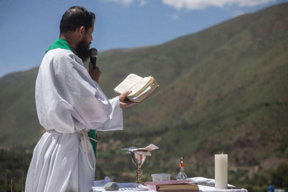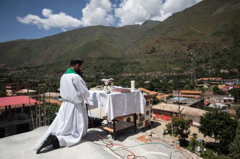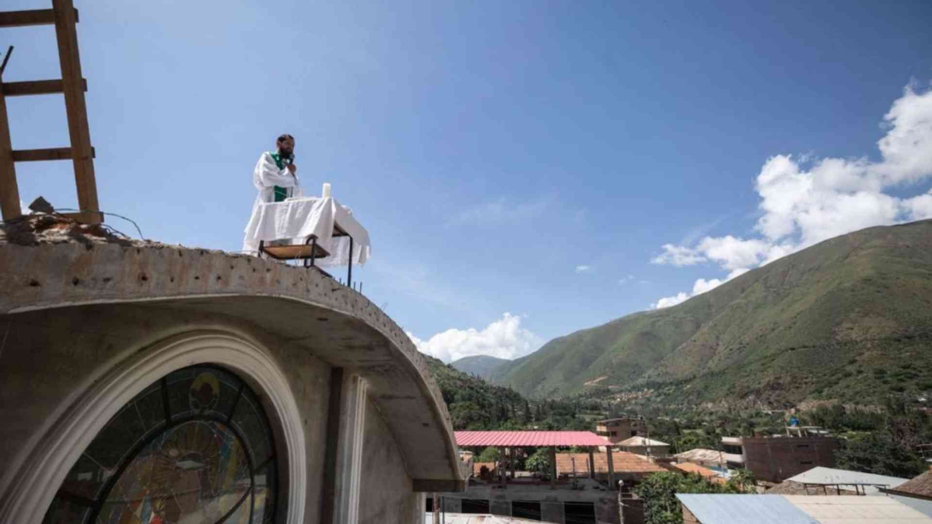 «A ogni ostacolo corrisponde una soluzione», afferma padre Juan López Diaz mentre indica la scala con cui, ogni domenica, si arrampica per 13 metri, fino a raggiungere il tetto della chiesa di Santa Rosa di Tomayquichua, nel cuore delle Ande peruviane. Là, su un tavolo-altare piazzato per l’occasione, alle 10 in punto, celebra la Messa dal 10 maggio 2020 quando le funzioni religiose in presenza di fedeli sono state sospese a causa della pandemia. Ovunque in Perù, come nel resto del mondo, i sacerdoti hanno portato l’Eucaristia su su reti sociali e piattaforme virtuali. Strumenti inaccessibili per i 3mila abitanti di Tomayquichua. «Fanno fatica a fare un pasto al giorno, figuriamoci chi può permettersi l’accesso a Internet», racconta ad Avvenire padre Juan. Oltretutto a oltre 2.400 metri di altitudine il segnale arriva a singhiozzo. Il prete, però, non si è perso d’animo.