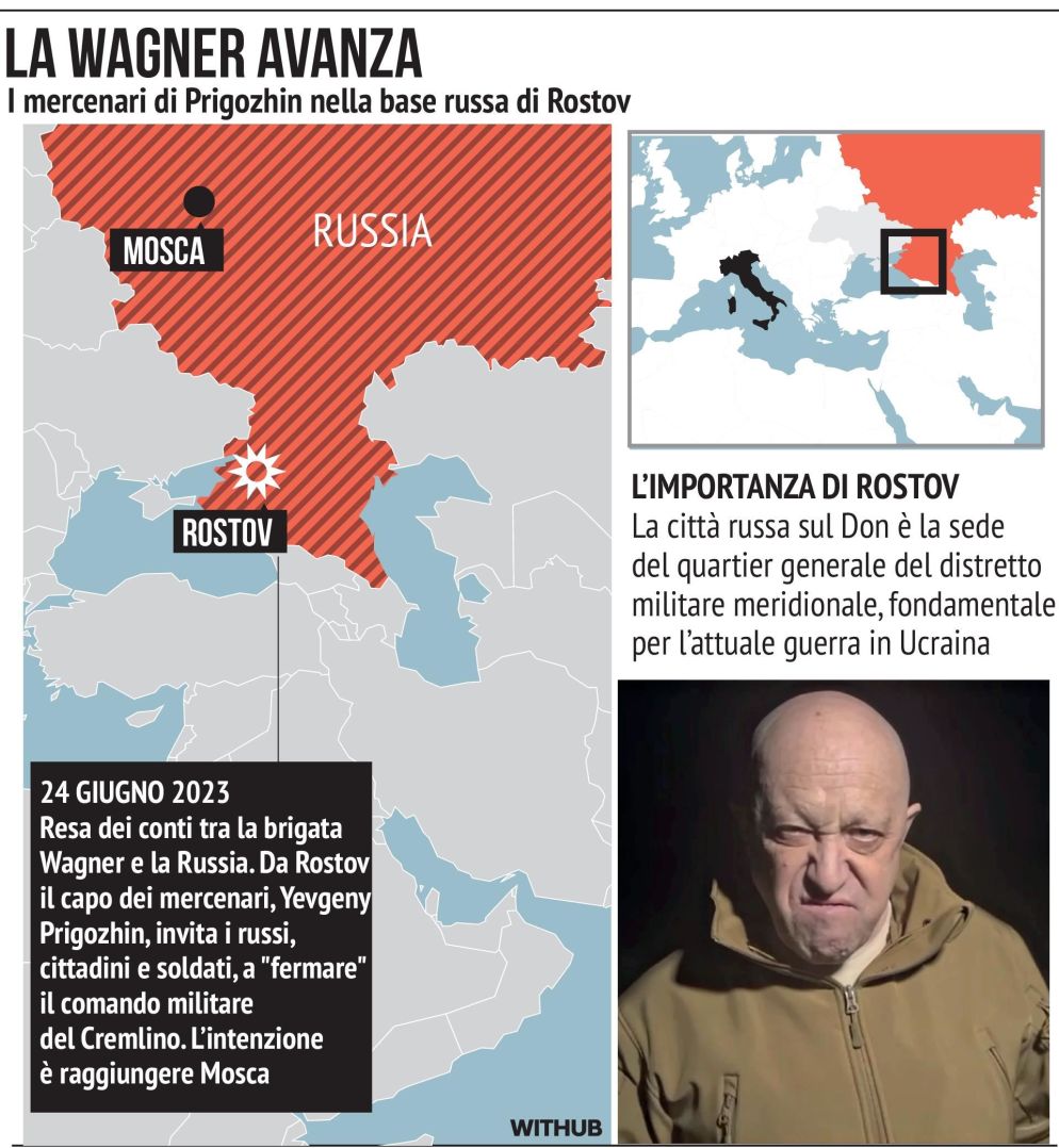 I primi convogli della compagnia sono rientrati dall’Ucraina questa notte nella direzione di Rostov sul Don, in Russia, dove rivendicano di aver preso il controllo di un aeroporto militare di altri siti strategici, mentre a Mosca è stato dichiarato l’avvio di operazioni antiterrorismo per timore di azioni del wagneriti nella capitale o dei gruppi della dissidenza armata che intendono approfittare del caos per dare attaccare i palazzi del potere. Il leader ceceno Kadyrov ha sciolto la riserva e ha annunciato l'invio delle milizie cecene per sedare la ribellione dei Wagner, che ha definito "tradimento". Sui social ha riferito che i suoi combattenti sono partiti "verso le zone di tensione”.