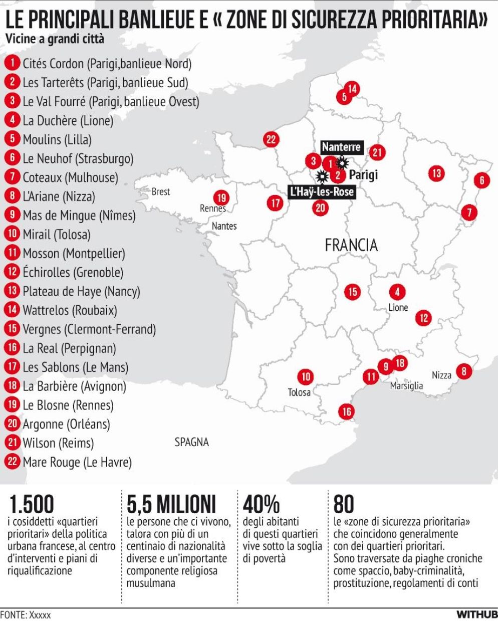 È certamente il nodo più visibile. Eredità talora di quegli anni Sessanta e Settanta in cui la Francia fece campagna pure nel Maghreb per reclutare le braccia mancanti nella propria industria, all’epoca galoppante, i quartieri-alveari delle banlieue rappresentano il simbolo di un’incontestabile segregazione urbana. Oggi, si chiamano ‘quartieri prioritari’, perché al centro di vasti piani di riqualificazione costati 12 miliardi di euro nel periodo 2004-2020, prima d’un bis dello stesso ammontare per il decennio fino al 2030. Sono circa 1.500 aree e contano una popolazione di 5,5 milioni d'abitanti. Il tasso di povertà vi supera spesso il 40%, con una forte dimensione multireligiosa, anche fra correnti dell’islam, collegamenti insufficienti, non di rado pure una criminalità cronica, tanto da far parlare in questi casi di «territori persi dalla Repubblica».