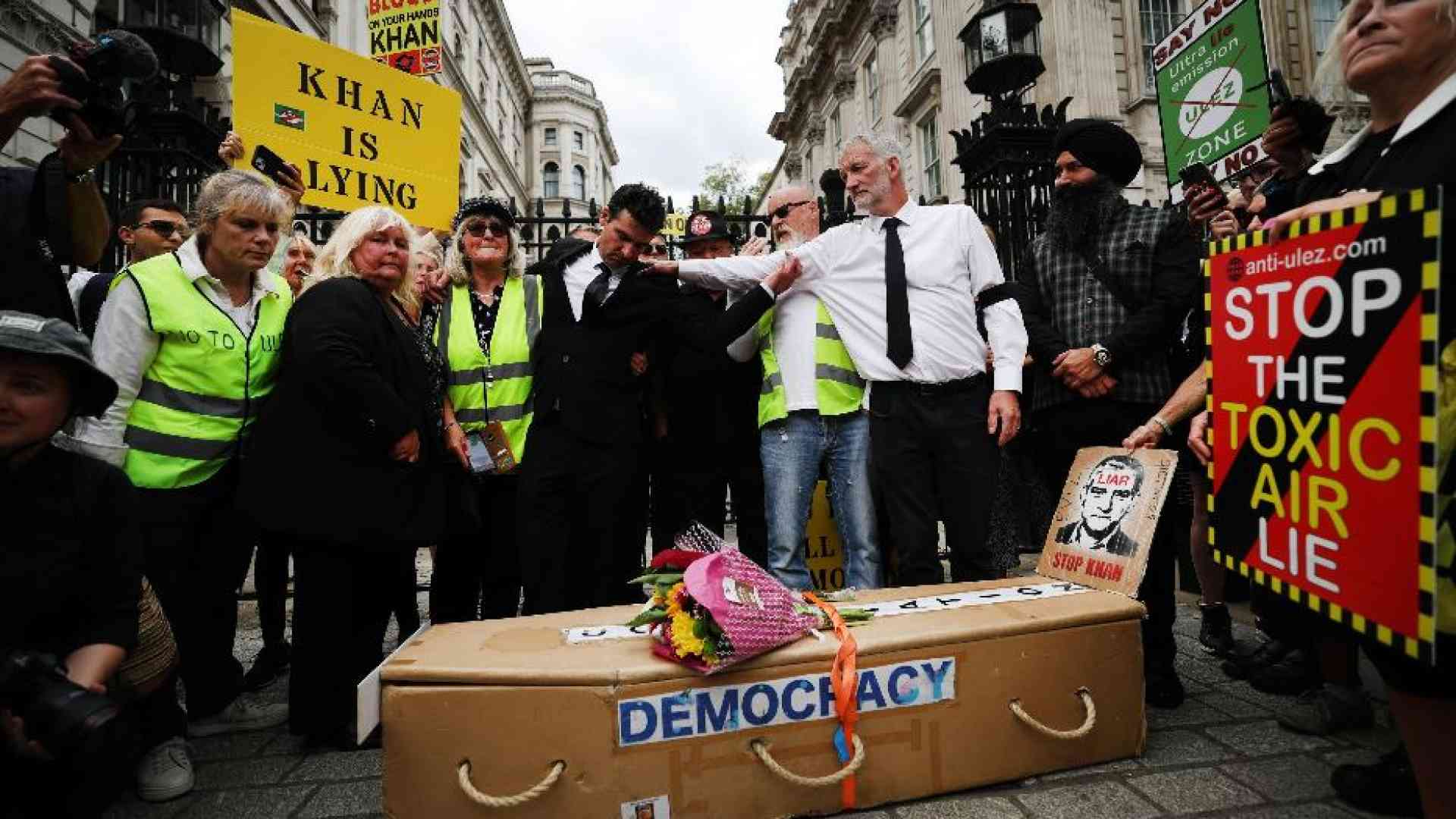 Il «no» dei londinesi alla nuova zona a traffico limitato, scattata ieri a mezzanotte su tutta l’area metropolitana della capitale, è riposto in una bara di cartone, con tanto di fiori (veri) ad adornarla, portata in spalla da Downing Street a piazza del Parlamento da un gruppo di manifestanti vestiti a lutto. È la messinscena del funerale della democrazia britannica. Bersaglio della dimostrazione è il sindaco Sadiq Khan, laburista e ambientalista, colpevole a loro dire, di aver imposto un piano che non piace a metà dei cinque milioni di cittadini che abitano dentro il raccordo circoscritto dalla M25. Il primo cittadino non si lascia tuttavia intimidire: «Sono dalla parte giusta della storia».