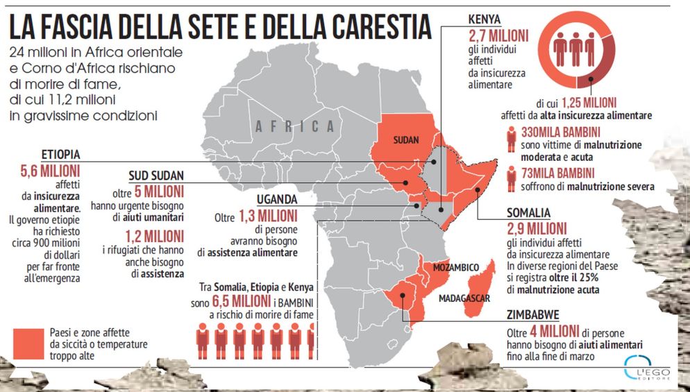 A questa situazione si somma ora una possibile carestia in quattro Paesi, Sudan del Sud, Somalia, Yemen e il nord-est della Nigeria. A febbraio l'Onu aveva allertato che circa 20 milioni di persone di queste nazioni sono in una situazione di carestia o di rischio attendibile di finire in una situazione critica nei prossimi sei mesi. L'Onu utilizza il termine carestia solo quando in una zona si registrano determinati livelli di mortalità, denutrizione e fame, situazioni estreme e molto poco abituali, con appena una decina di casi negli ultimi trent'anni.