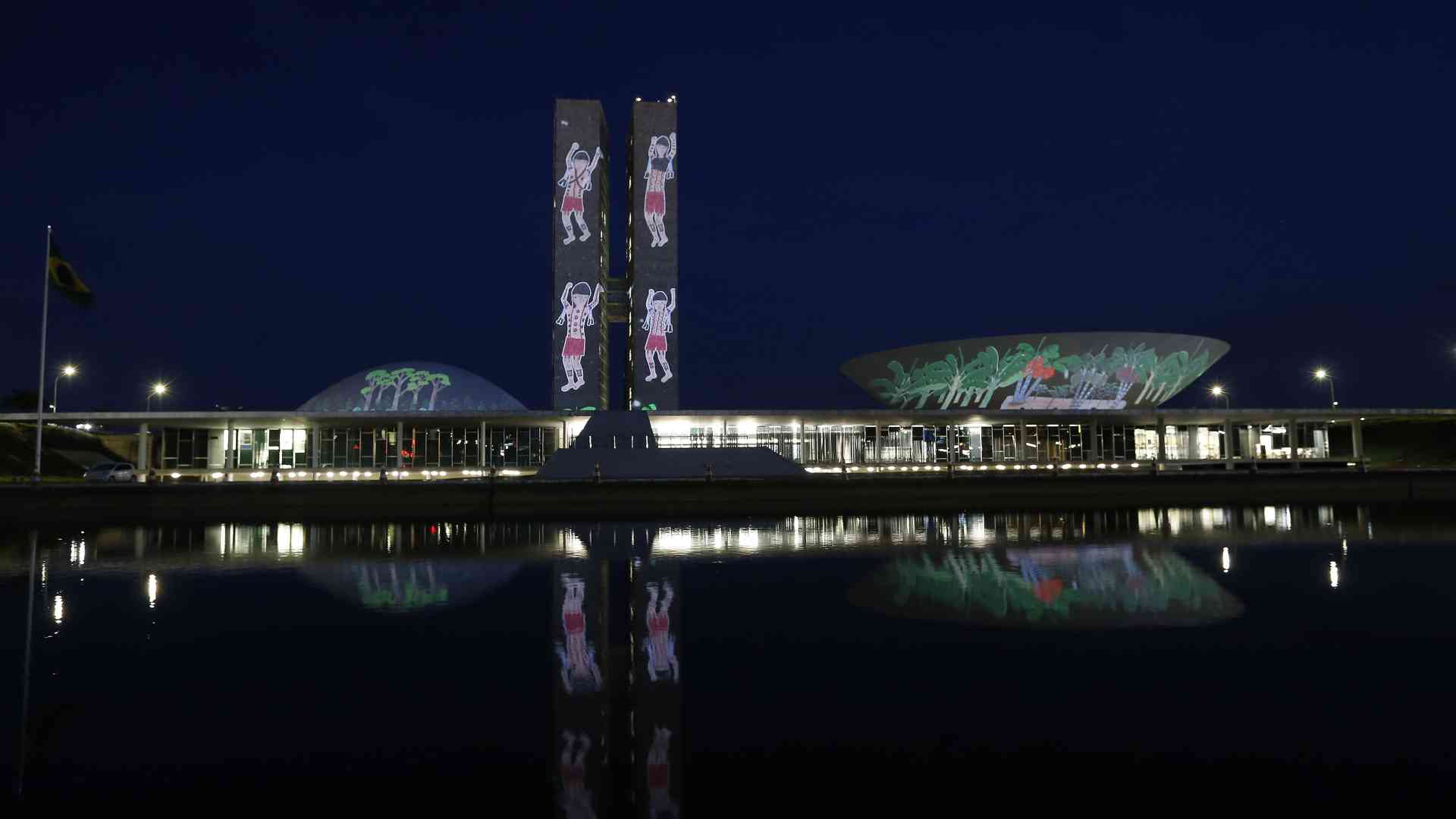 Gli indigeni, con l'aiuto di Survival International, hanno portato in Congresso la petizione per chiedere l'espulsione dei minatori dalle loro terre. E sull'edificio hanno proiettato i loro disegni