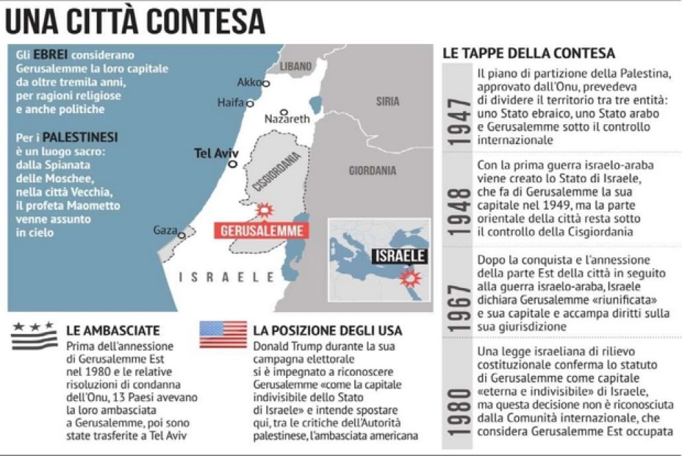 Gli ebrei considerano Gerusalemme la loro capitale da oltre tremila anni, per ragioni religiose e politiche. Dopo la distruzione del Tempio di Gerusalemme e la successiva dispersione del popolo ebraico, per il giudaismo il ritorno a Gerusalemme è rimasto un punto fermo. La Città Santa è l’antica capitale del Regno di Israele del re David (X secolo a.C.) e poi del Regno ebraico degli Asmonei (II secolo a.C.). I palestinesi, che costituiscono circa un terzo della popolazione della città, rivendicano Gerusalemme come la capitale dello Stato a cui aspirano. Gerusalemme per loro rappresenta una dimensione religiosa essenziale con la Spianata delle Moschee, nella città Vecchia, da dove il profeta Maometto venne assunto in cielo: è il terzo luogo santo per i musulmani.