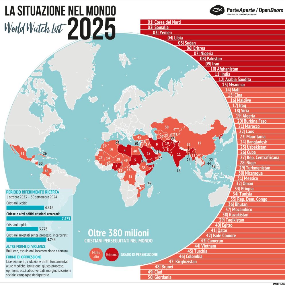 Rispetto all'anno precedente, l'Ong Porte aperte/Open doors ha registrato un ulteriore aumento di 15 milioni di casi. Raggiungendo un cifra record di persecuzioni che riguarda 380 milioni di persone