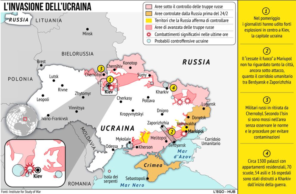 Non ha invece registrato progressi nelle ultime ore l'avvicinamento russo a Kiev attraverso un'operazione della fanteria di marina: a Kiev sostengono addirittura di aver riconquistato Bucha, un centro alle porte della capitale. Mosca ha annunciato di avere distrutto 52 obiettivi militari in 24 ore.