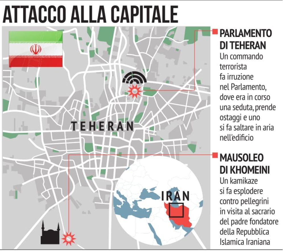 Attentato suicida al mausoleo di Khomeini. E assalto in Parlamento dove un altro terrorista si fa esplodere. I deputati scandiscono slogan contro America e Arabia Saudita. Catturati 2 attentatori