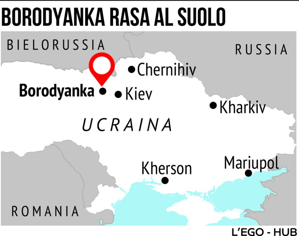 In un video pubblicato su Twitter e girato da Reuters con un drone viene mostrata la devastazione dopo un bombardamento russo di Borodyanka, una cittadina fuori Kiev, dove giovedì gli ucraini hanno respinto un attacco dell'esercito russo. Sono stati colpiti e semidistrutti vari edifici residenziali. Il bilancio delle vittime sarebbe altissimo: si parla di 100 persone rimaste sotto le macerie.