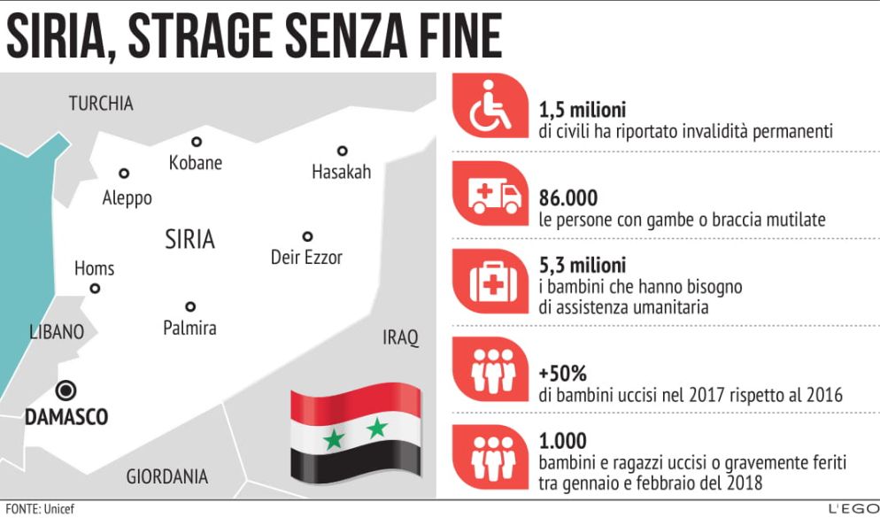 La guerra civile, di anno in anno, colpisce in modo particolare i minori. Nel 2017, denuncia l'Unicef, il conflitto ha ucciso in Siria il numero di bambini più alto di sempre, 50% in più rispetto al 2016. Soltanto nei primi due mesi del 2018, sembra siano stati uccisi o feriti mille bambini. Il conflitto è attualmente la prima causa di morte fra gli adolescenti nel Paese e l'Unicef lancia l'allarme in particolare per i bambini con disabilità, che rischiano di rimanere esclusi e dimenticati. Secondo i dati dell'agenzia Onu, nel 2017 sono state registrate 1.271 vittime tra i bambini: 910 morti e 361 feriti, molti sono diventati disabili, inoltre il 17% delle vittime ferite da armi esplosive sono bambini. Un numero stimato di 3,3 milioni di bambini in Siria è esposto al pericolo di incorrere in esplosivi, fra cui mine, ordigni inesplosi e ordigni esplosivi improvvisati. Oltre 1,5 milioni di persone vivono attualmente con invalidità permanenti causate dalla guerra.