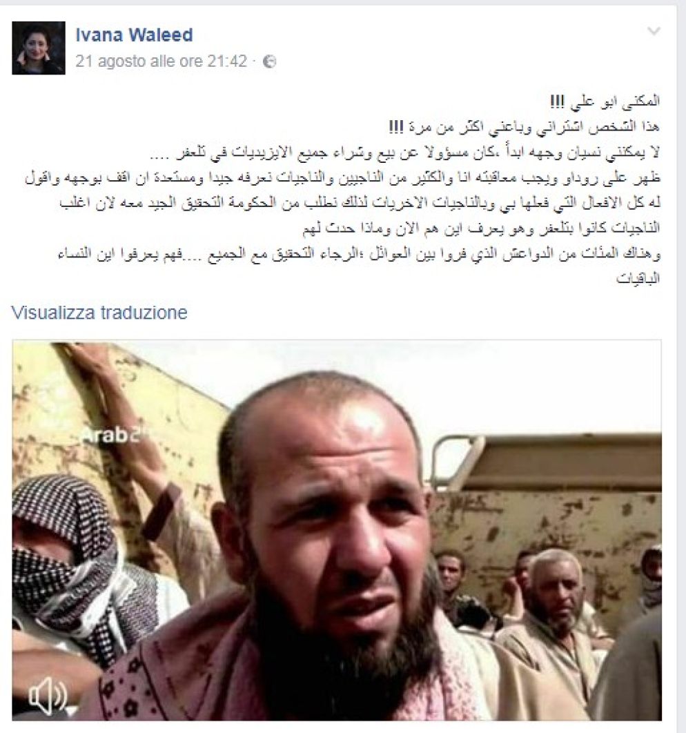 Vede il suo aguzzino in tv, intervistato tra i rifugiati fuggiti dal Daesh, e lo denuncia su Facebook pubblicando anche la sua foto: "È lui, si faceva chiamare Abu Ali ed era il mercante" delle schiave del sesso yazide rapite dagli uomini del Califfato nero nel Nord dell'Iraq nell'estate del 2015. La ragazza si chiama Ivana Waleed, ora vive in Germania, e afferma che lei stessa, come molte altre ragazze yazide, è stata oggetto delle compravendite dell'uomo nella città di Tal Afar, ultimo bastione del sedicente Stato islamico nel Nord dell'Iraq, oggi al centro di una vasta offensiva delle forze irachene.