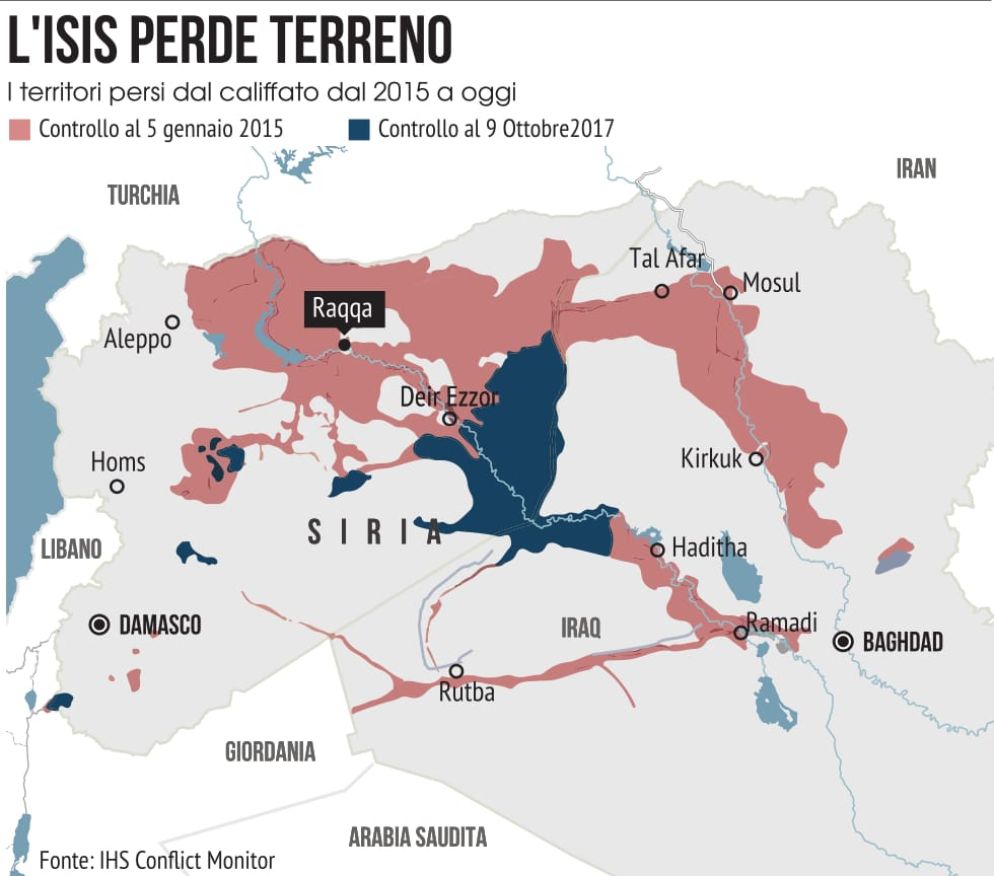 Le Forze democratiche siriane (Fsd), alleanza di milizie curde e arabe appoggiate dagli Usa, hanno piantato la bandiera dell'Ypg all'interno dello stadio di Raqqa, una delle ultime aree che rimanevano in mano al Daesh nella sua ex roccaforte. L'Ypg curda è la più forte delle milizie rappresentate nelle Fsd (Sdf la sigla in inglese).
