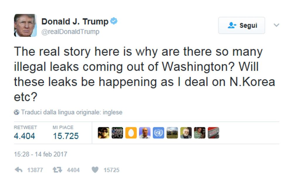 La vera storia qui è perché ci sono così tante fughe di notizie illegali a Washington? Ci saranno anche quando mi occuperò di Nord Corea ecc?". Lo scrive su Twitter Donald Trump, con chiaro riferimento alla vicenda che ha portato alle dimissioni di Michael Flynn, che tuttavia non menziona mai direttamente.