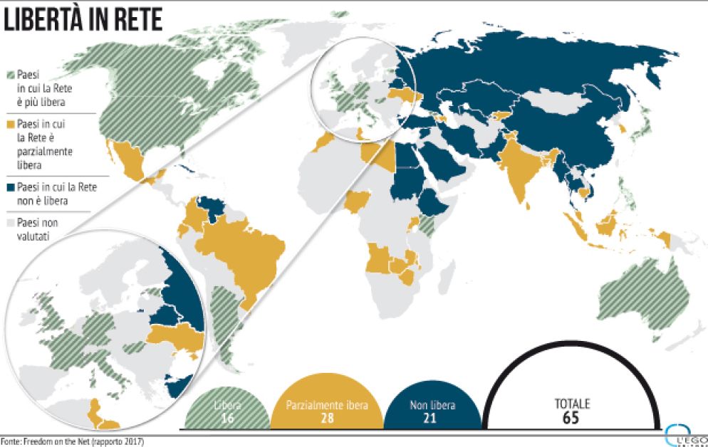 «Molti governi nel mondo hanno aumentato drammaticamente gli sforzi per manipolare le informazioni attraverso i social network». A leggere il rapporto Freedom on the Net, sulla libertà nella Rete, c’è di che preoccuparsi. Si scopre, per esempio, che le manipolazioni emerse durante le ultime elezioni americane sono molto più diffuse di quanto si credeva. «La manipolazione e la disinformazione online, nell’ultimo anno, hanno avuto un ruolo importante nelle elezioni di almeno 18 Nazioni, inclusi gli Stati Uniti». Nella lista ci sono Gambia, Bahrein e Zambia ma anche Francia, Russia, Iran, Filippine, Turchia e Messico. Non solo. «Un numero record di governi nell’ultimo anno ha manipolato i servizi di telefonia mobile per motivi politici o di “sicurezza”, spesso nelle aree popolate da minoranze etniche o religiose». Il Paese che ha maggiormente limitato la libertà di Internet è stato, per il terzo anno consecutivo, la Cina, seguito dalla Siria e dall’Etiopia. Il rapporto ha preso in esame 65 Paesi in tutto il mondo, che rappresentano l’87 per cento degli utenti mondiali connessi alla Rete.