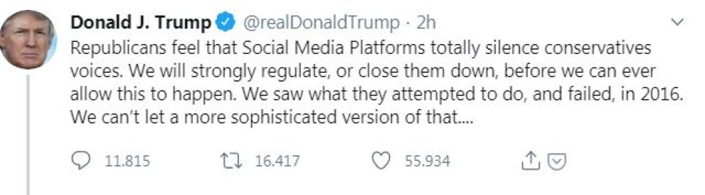 L'ira di Trump si è sfogata subito sulla stessa piattaforma, con accuse pesanti. "Twitter sta interferendo nelle elezioni presidenziali 2020. Stanno dicendo che la mia dichiarazione sul voto per posta, che porterà ad una massiccia corruzione e alla frode, non è corretta, basandosi sul fact-checking delle Fake News Cnn e del Washington Post", ha twittato. "Twitter sta completamente sopprimendo la libertà di parola ed io, come presidente, non consentirò che accada!", ha aggiunto. e poi ancora, in un altro post: "I Repubblicani ritengono che le piattaforme di social media mettano a tacere totalmente le voci dei conservatori. Le regoleremo con forza o le chiuderemo prima di poter permettere che ciò accada", ha reagito ancora Trump, usando sempre Twitter, il suo social prediletto.